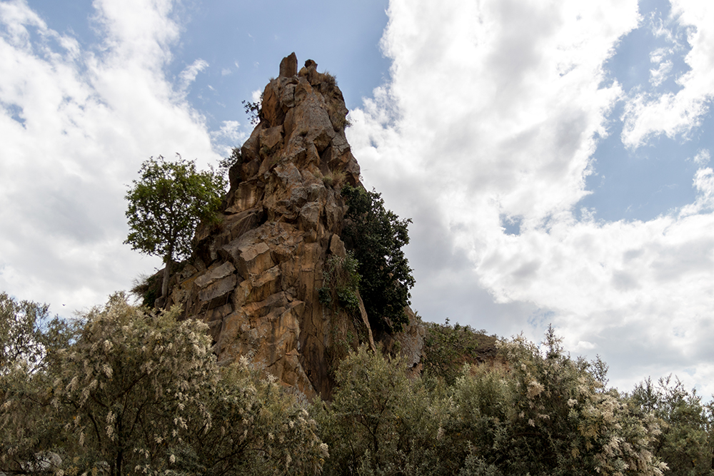 Our guide pointed out a small waterfall trickling down a nearby rock face, and we felt the water to discover it was a hot spring. He also showed us that the canyon floor was littered with chunks of obsidian, and broke some of it to demonstrate how sharp it can be. He said he was from the Maasai tribe, and that they use obsidian to make spears and knives.