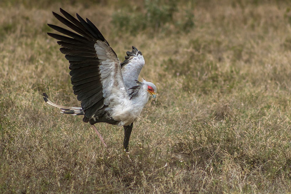 I couldn’t watch the monkeys for too long because we still needed to have time for one last tour, so we hopped in the van and drove back out of Hell’s Gate. As we neared the entrance, Fred made a sudden stop, and I jumped to my feet in excitement when I saw what he was looking at. Two secretary birds were promenading through the dried grasses. As an amateur birder, I have a somewhat extensive list of birds that I would love to see, and the secretary bird was one that I had specifically hoped to see while we were in Kenya. I couldn’t believe that I was getting my wish on the first day of the trip!