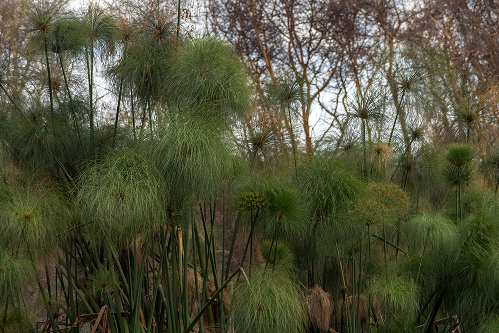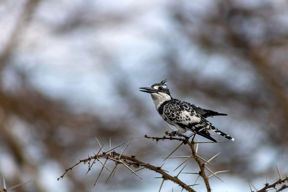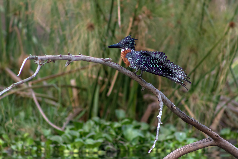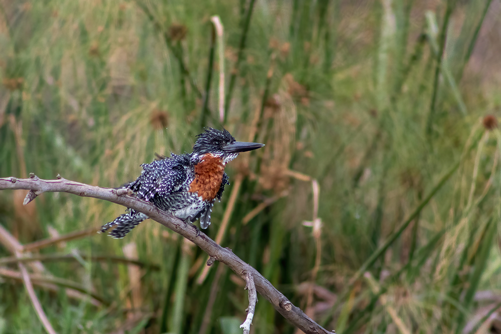Shortly after the hippo sighting, we found even more spectacular birds. First there were a couple of pied kingfishers perched in a thorny tree, and then we discovered a gorgeous giant kingfisher near a fluffly papyrus plant.