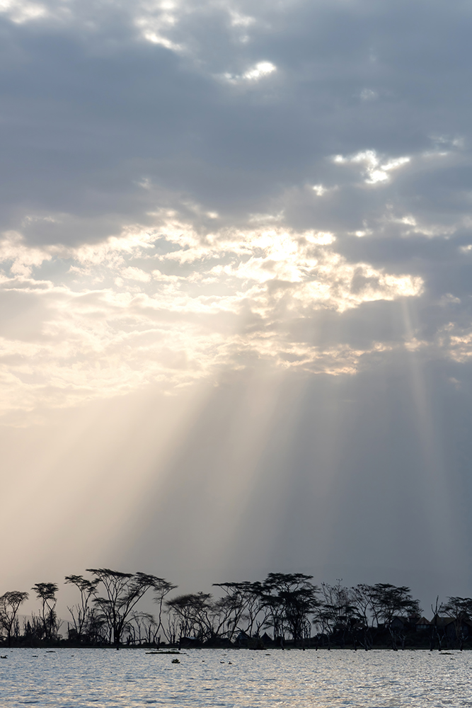 By now, the sun was beginning to set, which caused heavenly rays of light to pierce through the thick clouds. Our guide steered the boat across the lake, and I enjoyed a pleasant breeze as we floated through the calm water.