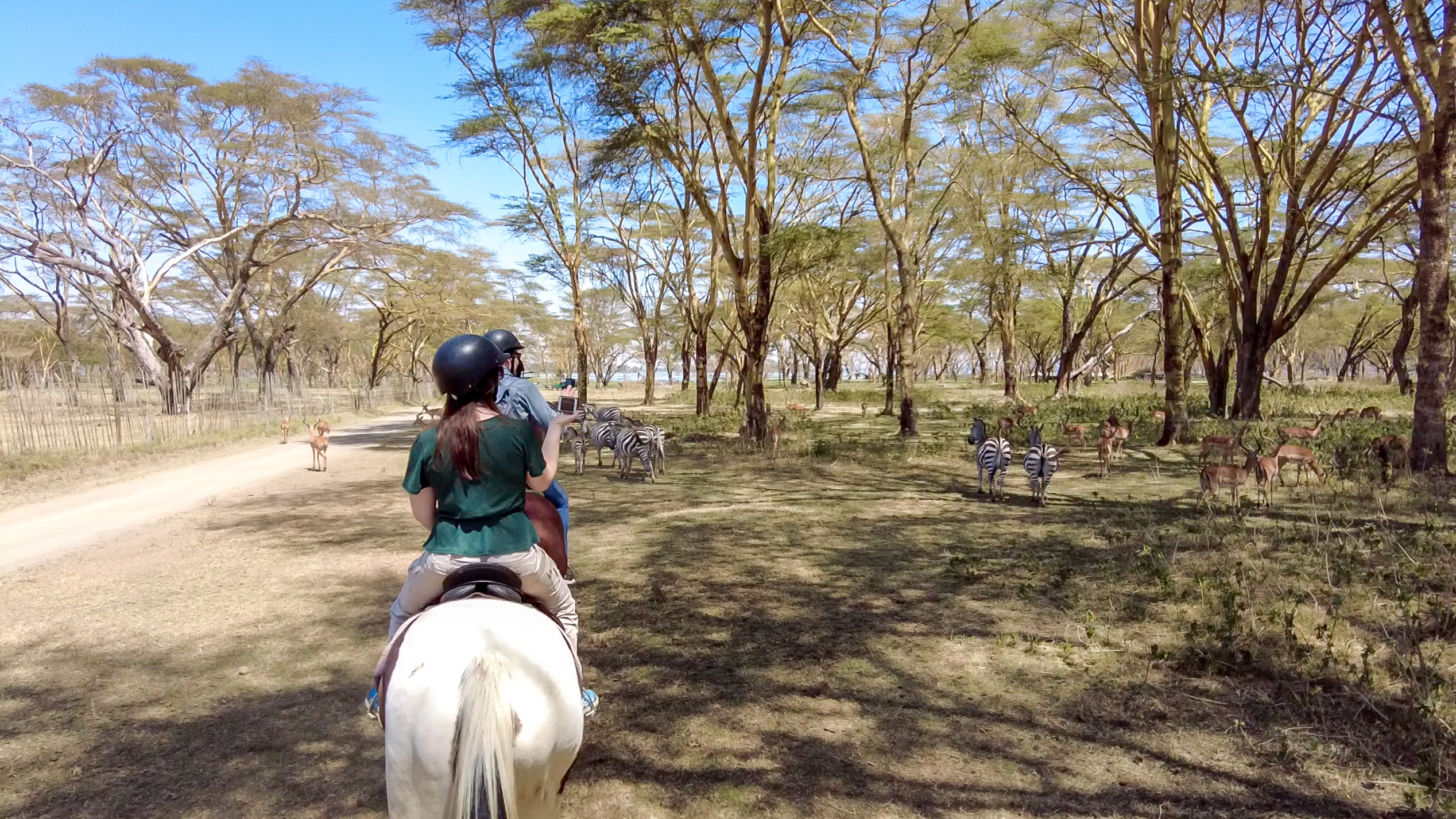 The Great Rift Valley overlook was just the beginning of what would be a long day trip to Lake Naivasha and Hell’s Gate Canyon, and our next stop was at Sanctuary Farm to kick the trip off with a horseback safari. Upon our arrival at the farm, we were given helmets and paired with horses. I was matched with a tall thoroughbred named Fabergé, and I was the first to get to climb into my saddle. This meant I had plenty of time for my excitement to grow as the others were given their horses one by one. By the time we set out on the trail, I was practically bouncing out of my saddle in anticipation. This excursion had been my pick. A friend of a friend tipped me off to it, and I immediately fell in love with idea of riding a horse alongside zebras and giraffes (one of my all-time favorite animals).