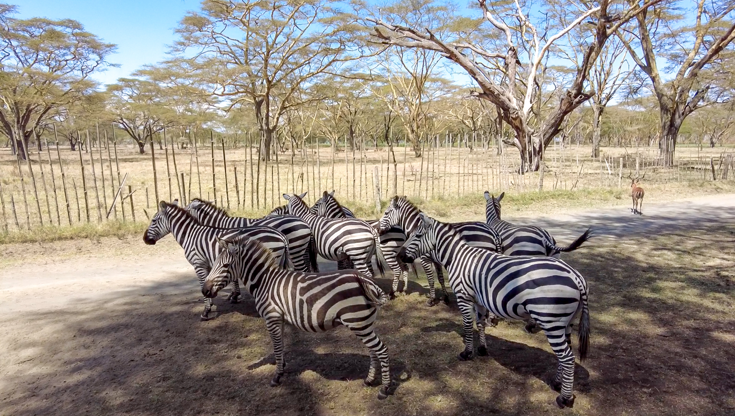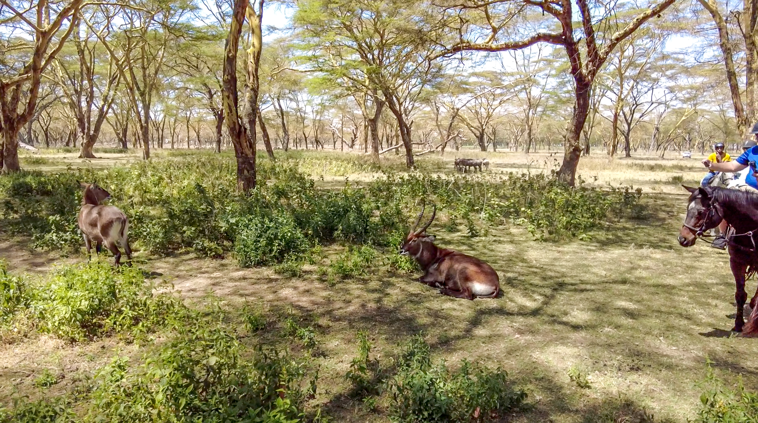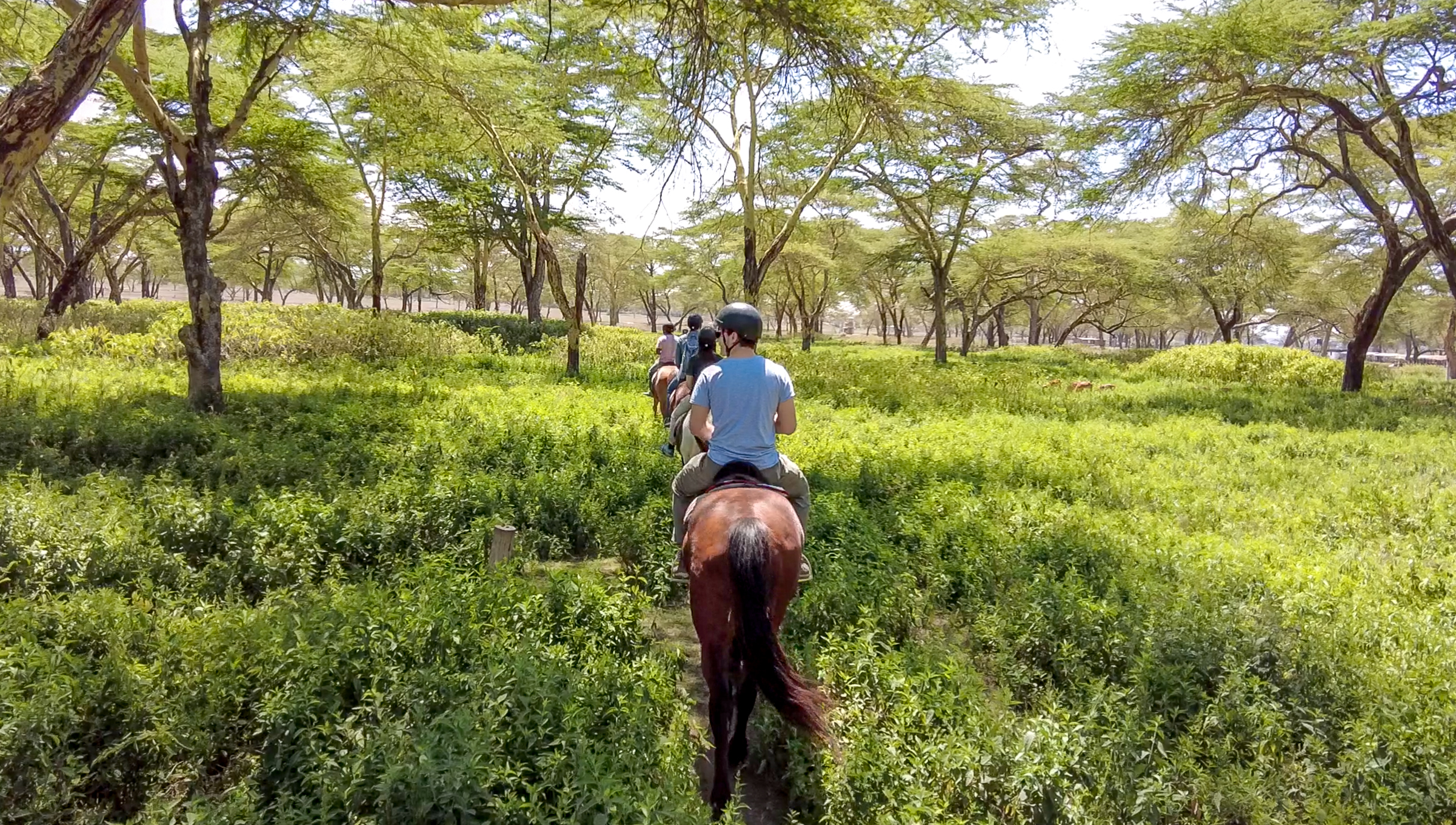 We rode uphill where the verdant acacias were replaced by massive euphorbia trees, and the landscape became more dry and barren. From that vantage, we could see different stages of vegetation stretching towards Lake Naivasha. The land faded from brilliant green near the lake to dusty beige atop the hill. Eventually we made it back down to the lake where we caught a glimpse of our first hippo of the trip, then we retreated to the farm where we dismounted our horses and met back up with Fred.
