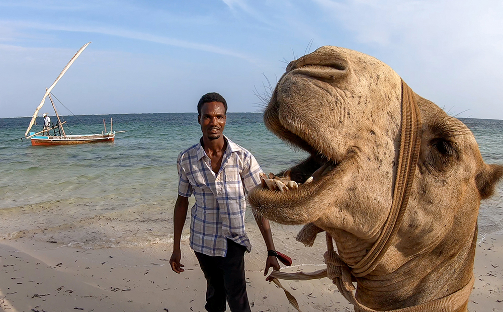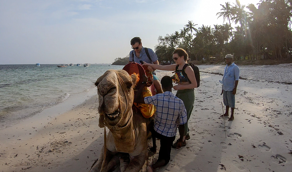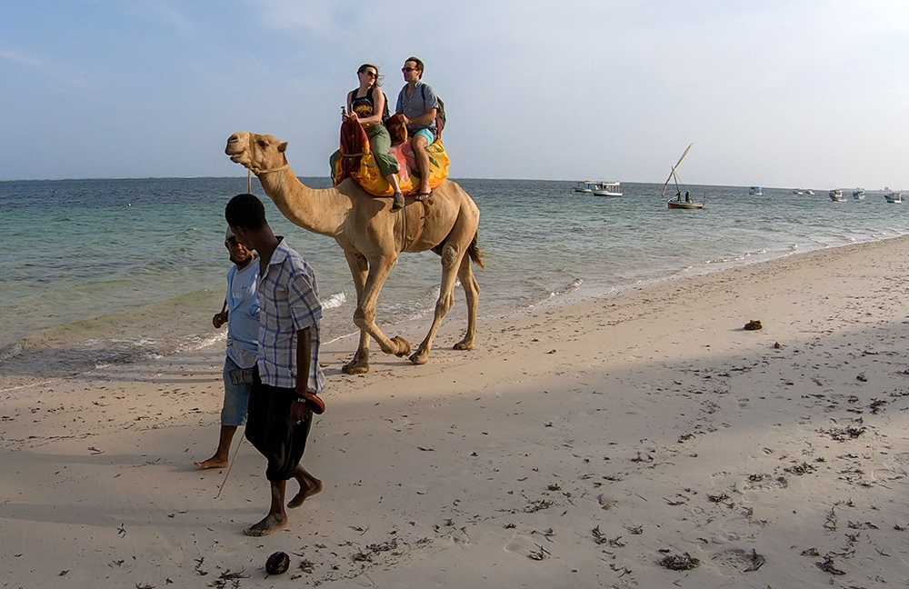 Charlie Brown’s owner asked if any of us wanted a ride, and then said it would cost 2,000 Kenyan Shillings (nearly 20 USD). This was too much for us so we said no thanks and continued walking along the beautiful shoreline. We all knew that wouldn’t be the last we would see of Charlie Brown, and soon enough, he and his owner had caught up with us and the haggling began. I’ve never haggled while being trailed by an eight foot tall camel before, so that was something new. We eventually settled on a price, and soon Vince and I were up in the saddle, lurching down the beach as Amy and Andrew filmed us.