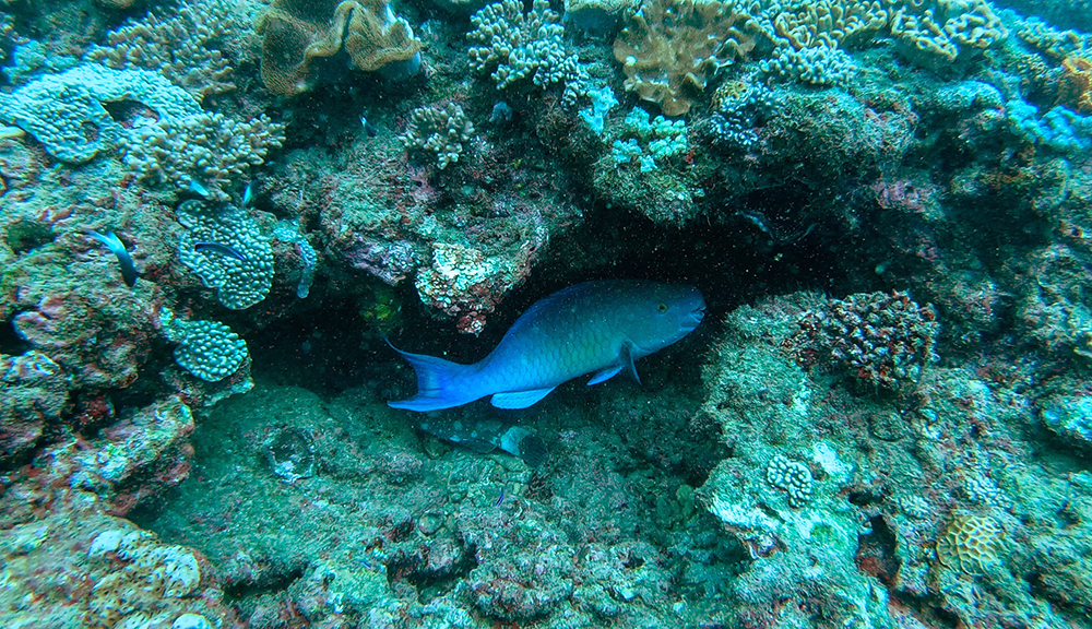 It was a cloudy morning, so we weren’t counting on great visibility as we set out toward the reef on a small boat. The captain steered us out to the far side of the reef, where we had a short briefing on our first dive before gearing up and rolling into the water. Of the various methods of entering the water on a dive, rolling backwards off the boat is my absolute favorite. Something about it feels more exciting and elegant than slogging into a shore dive laden with heavy gear, or slopping off the end of the boat. I was a little nervous about how long it had been since our last dive, and about my leg with its new internal hardware would perform under (literal) pressure. After the roll-off though, I felt nothing but pumped and ready to dive.