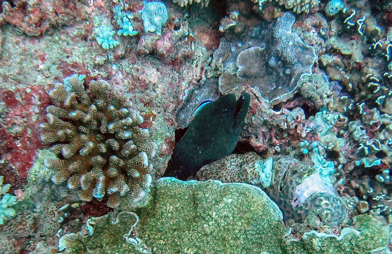 We let the air out of BCDs and sunk down to the ocean floor which was covered with a beautiful reef and countless waving anemones. The current was somewhat strong, and we had to go with the ebb and flow of the water as we swam above the reef. Visibility wasn’t great, but we saw all sorts of colorful fish, and a couple of moray eels on our first dive.
