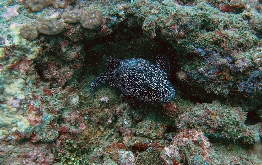 We made our five meter stop, and then burst through the surface of the waves near our waiting boat. While we waited out our surface interval (an amount of time spent between dives so nitrogen can off-gas from your body), I ditched a kilo off of my weight belt to solve my negative buoyancy problem. Before long, we were back in the water, descending back toward the reef. This dive was very similar to last, but we caught a glimpse of a hawksbill turtle and saw a massive lobster, a leaf fish, and got really close to a guinea fowl puffer.