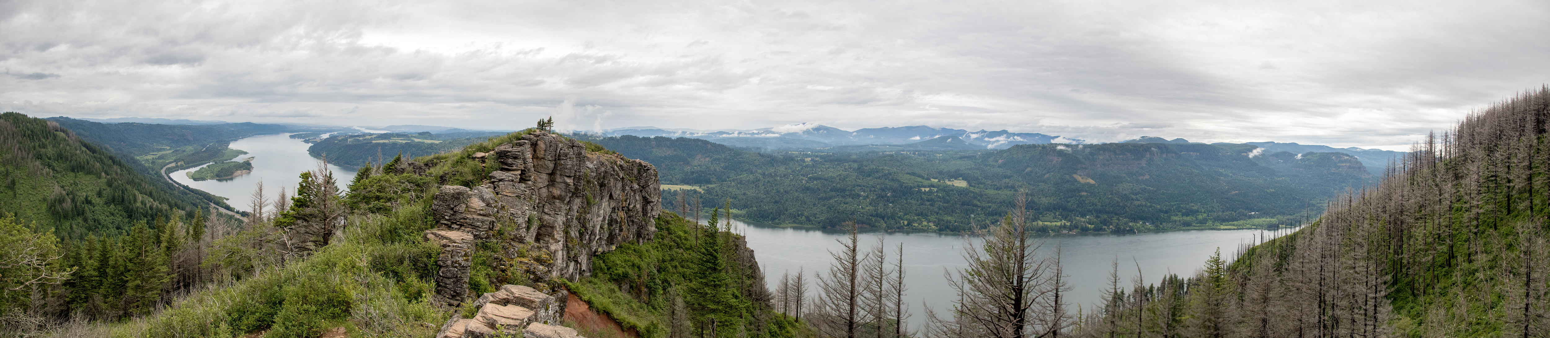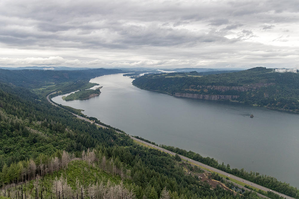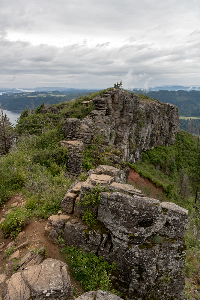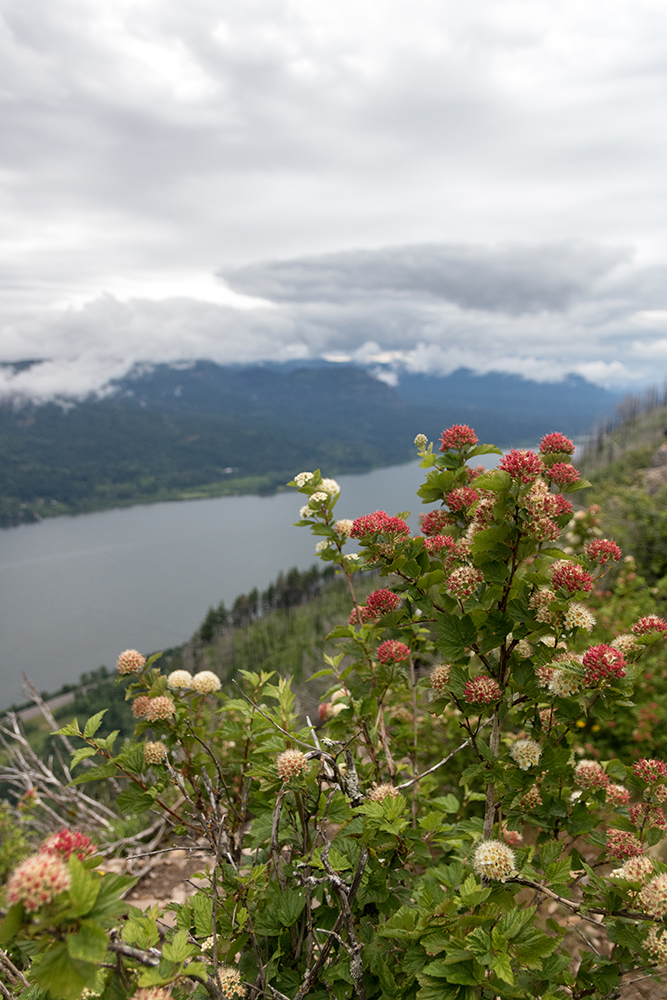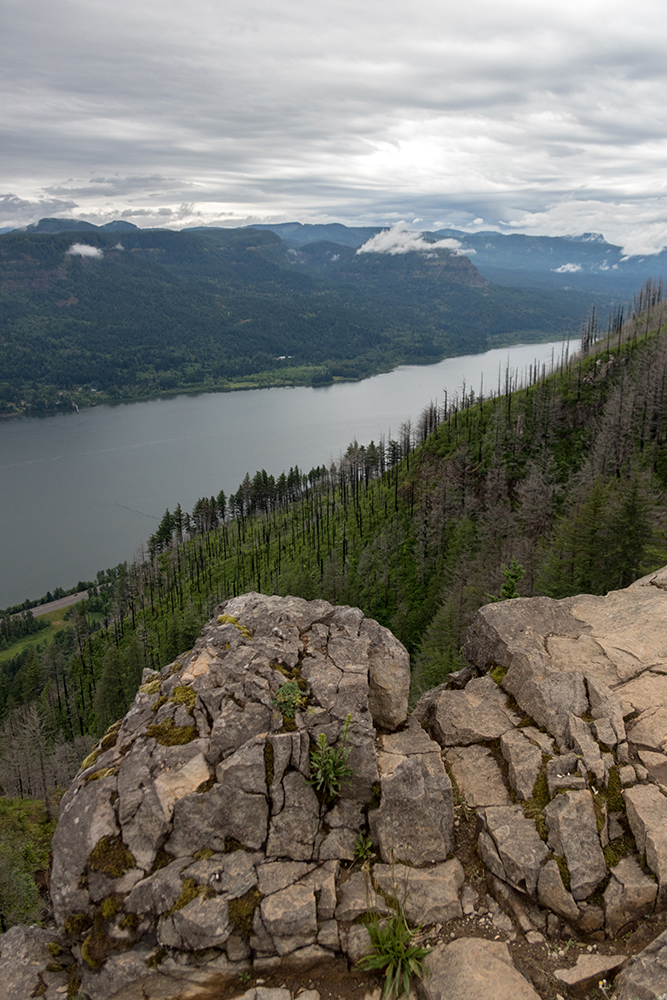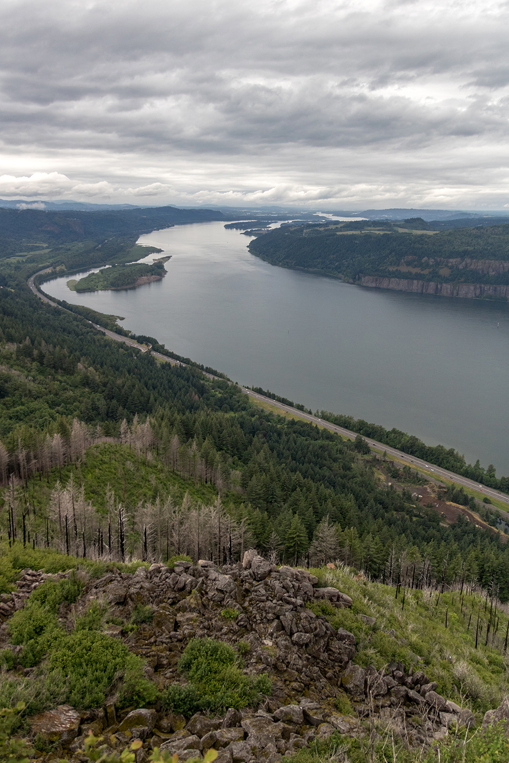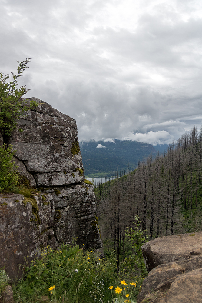 Once we were on the ridge line of Angel’s Rest, we were surrounded by awe-inspiring views of the Columbia River, which was shrouded overhead by dramatic clouds. We hiked all the way out to the end of the ridge and stopped to admire our hard-won view. It felt like we were on top of the world, even though the road was a mere 1,500 feet below us.