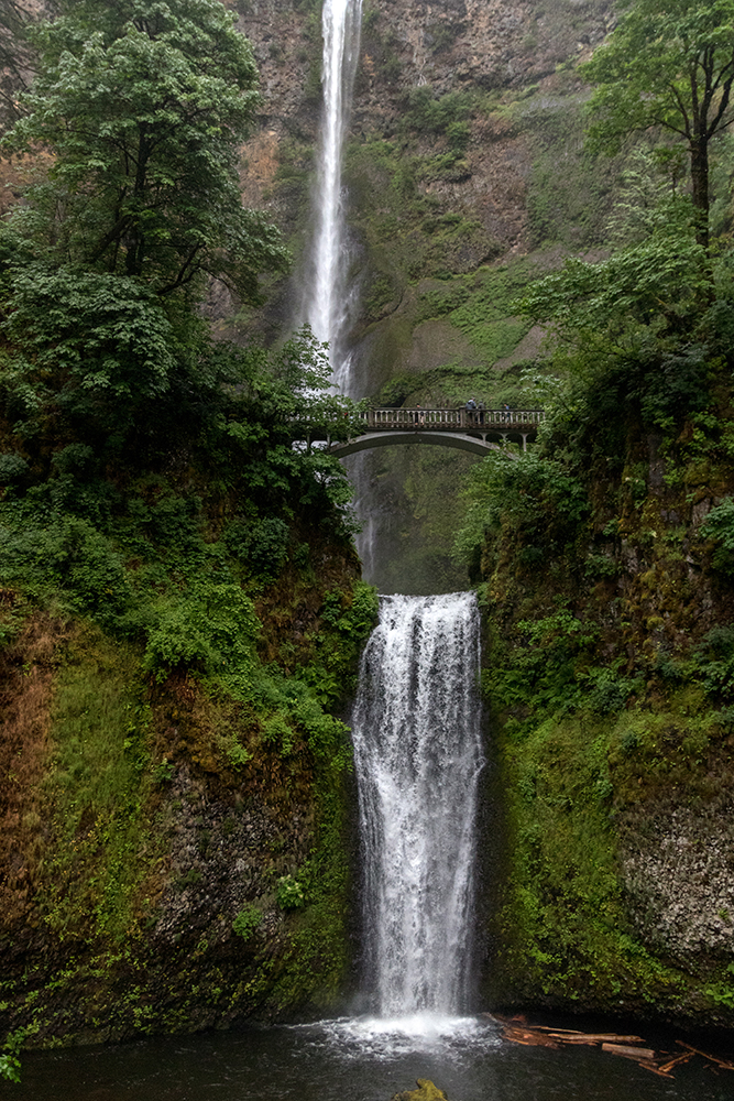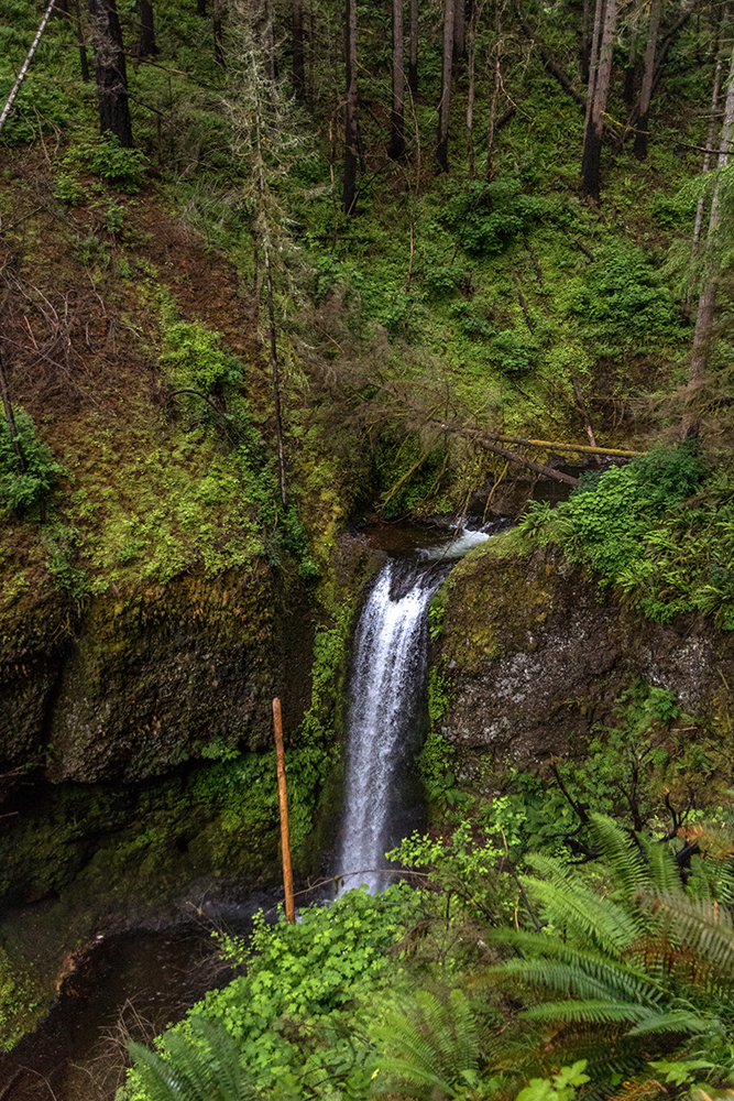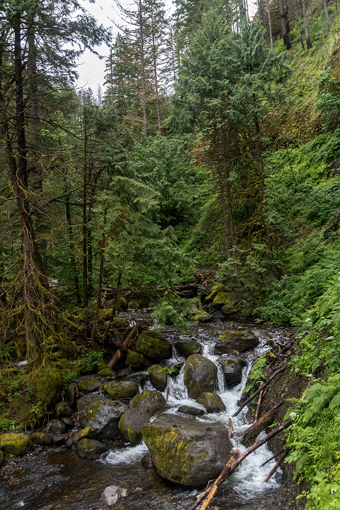 We arrived early, not to beat the crowds, but because we were planning to undertake a much longer hike starting from Multnomah Falls. We took two cars and parked them at different trailheads because we’d be doing a nine mile through hike, not a loop; then we enjoyed the view at the falls before heading uphill. I tried to take some long exposure shots yet again, but it was a rainy morning, and I had meager success.