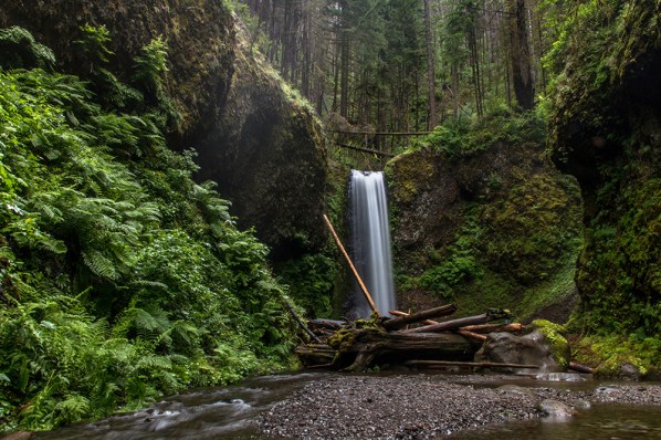 As we started our 2.5 mile descent from Angel’s Rest, the weather again turned to rain, and we were all relieved to get back to the warm, dry car that was waiting for us at the parking lot. We had a quick snack of Mount Hood strawberries, and then Vince and Andrew dropped the rest of us off at nearby Wahkeena Falls while they went to retrieve our other car from the Multnomah trailhead. I didn’t attempt many pictures at Wahkeena Falls because it was so rainy, but I couldn’t resist risking my camera at our next stop.
