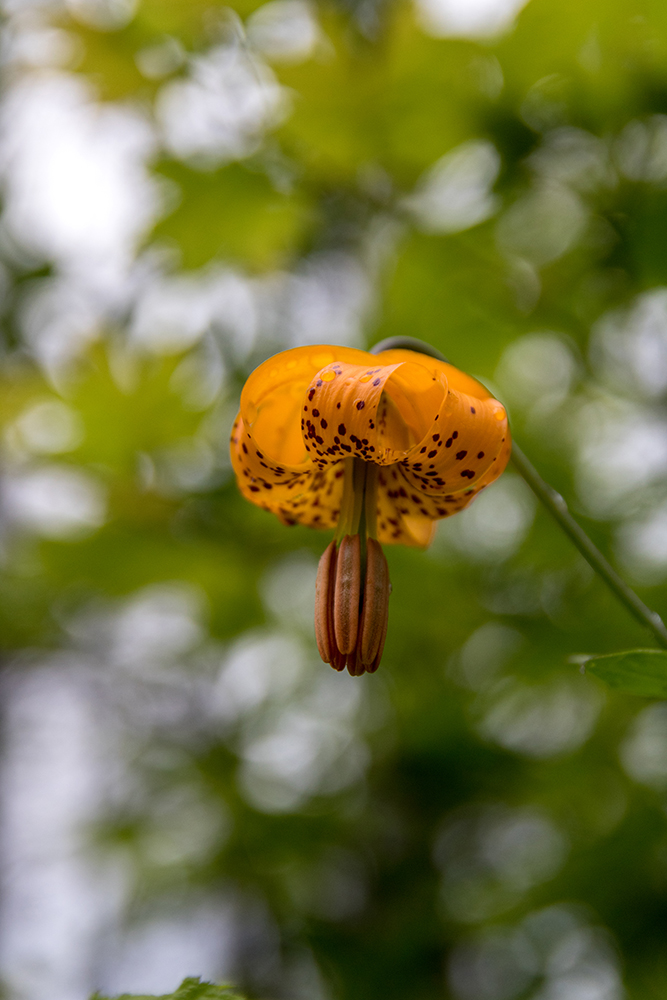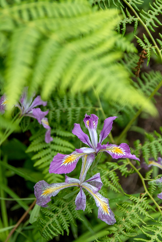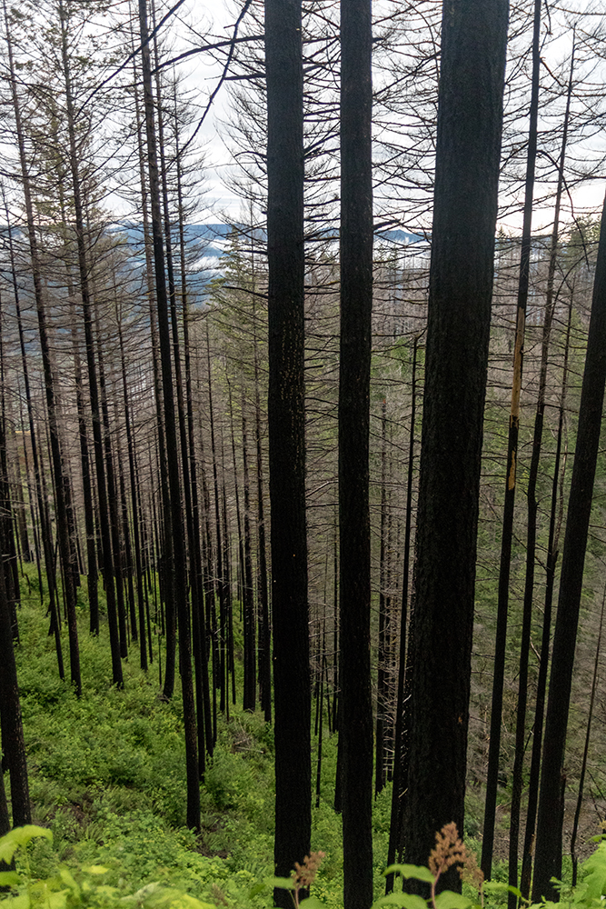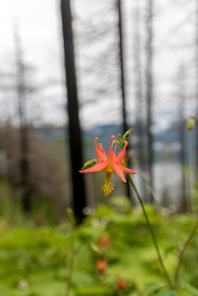 Not long after our break at the waterfall, we headed on another uphill slog, although this time we were deeper into the woods and there were fewer other hikers. The trail was narrow now, and fringed with tall vegetation that brushes against our arms as we walked. Every so often, we would pass through areas that were dotted with beautiful wildflowers. Columbine, lupin, irises, and Columbia lily stood out brilliantly against a backdrop of charred trees that had been burned in a recent fire.