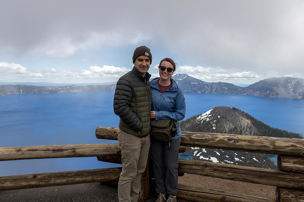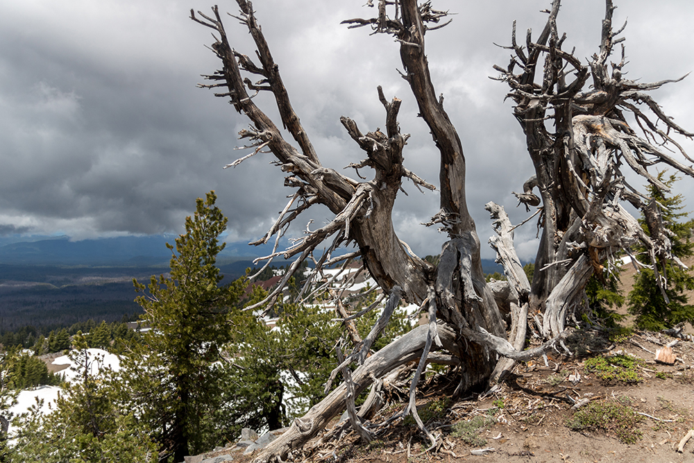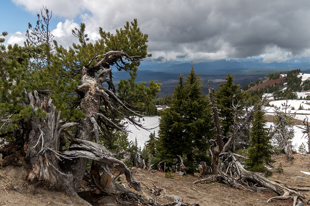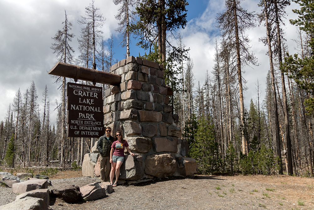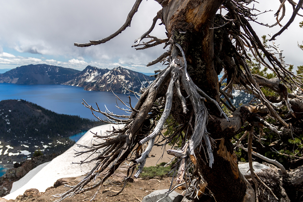 It took a few hours of driving to get to the park from Portland. We arrived in late morning and went through the standard ritual of taking a picture with the park sign, and grabbing a brochure from the entrance station. I immediately opened the brochure and started directing Vince to scenic overlooks while also reading about some of the features that make Crater Lake unique. I was particularly interested in information about the old white bark pine trees that line the crater rim. The oldest of these trees is over 500 years old, and I got excited as I anticipated seeing their scraggly, twisted branches in front of the lake.