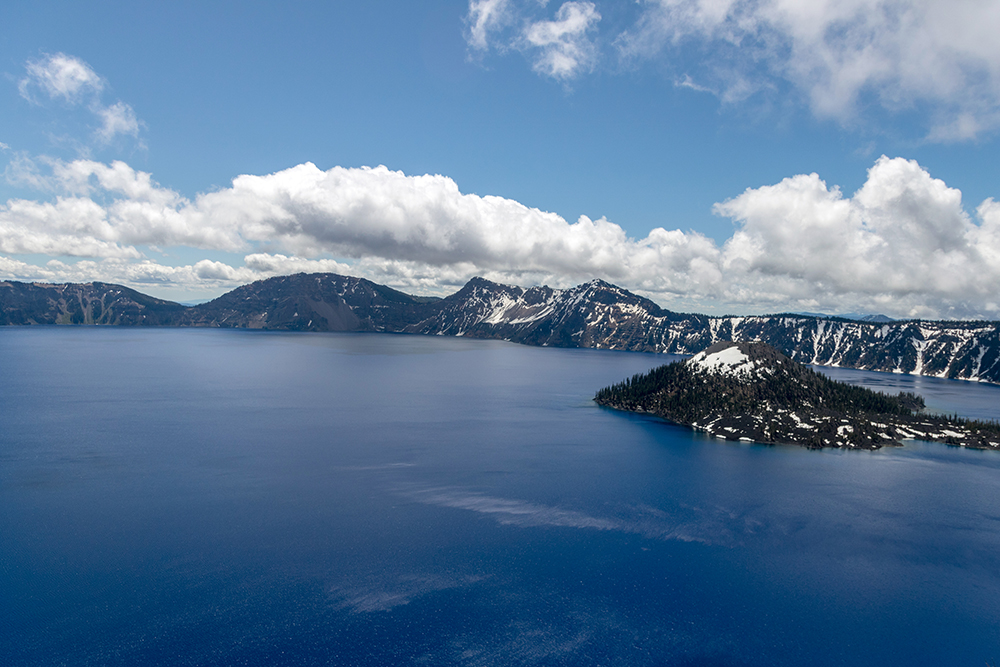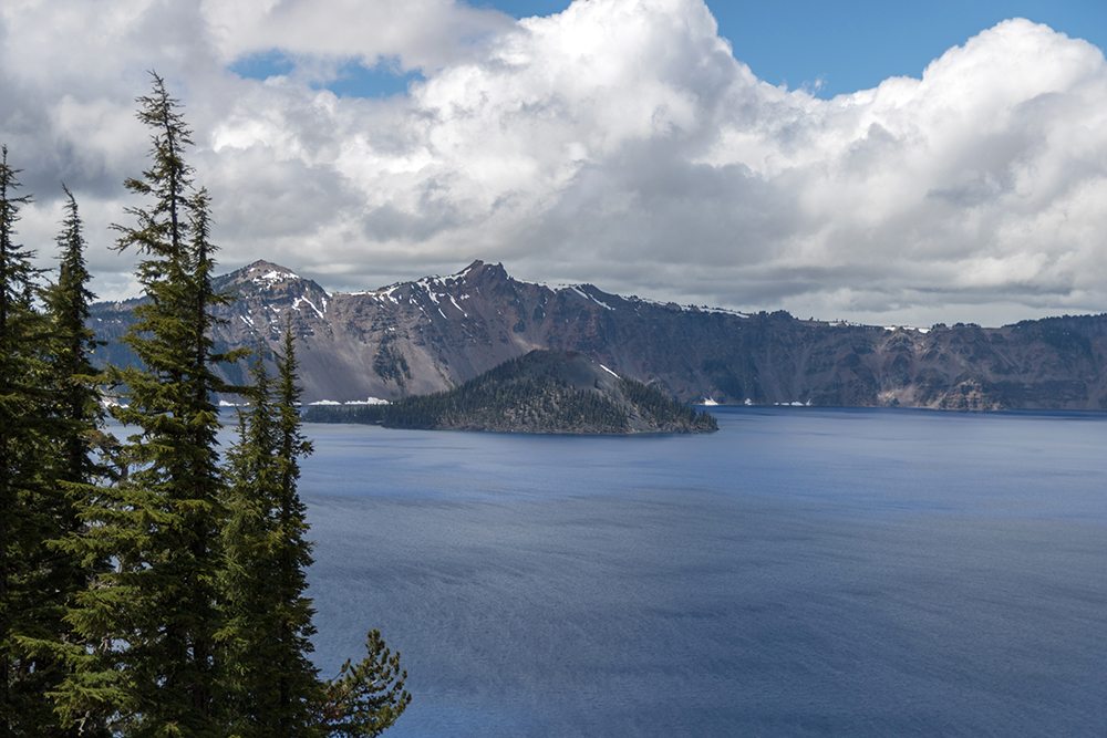 Wizard Island is a cinder that formed after the eruption of Mount Mazama about 7,700 years ago. A volcanic crater is visible at the summit of the island, which is accessible by boat in the summer for people willing to hike in and out of the steep Cleetwood Cove trail. Normally I would have been game, but the park’s boat tours were cancelled for the 2021 season because of Covid, so that wasn’t an option for us.