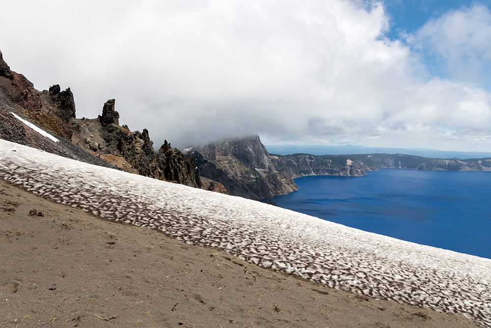 An uphill push brought us back to the rim of the crater where there was still a lot of snow pack. To my Michigander self, it feels novel to stand on snow in June, even though I’m well aware that it’s nothing special in the mountains. Either way, I excitedly took off my jacket to get a goofy, short-sleeved summer snow picture.