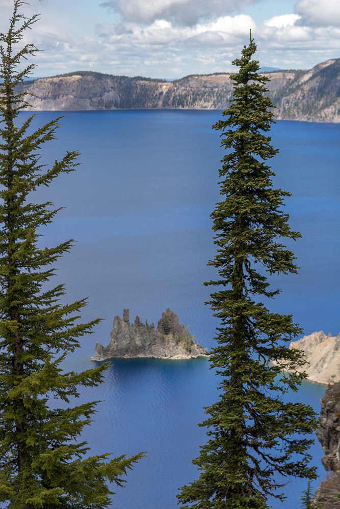 There was still plenty of day left to fill when we finally emerged from the visitor center, so we decided to follow the Rim Drive until we reached the road closure and then backtrack and visit whatever was open. The road ended being shut down right after the trailhead for the Phantom Ship Overlook so we stopped and hiked up to see the jagged rock formation in the water far below. Somehow, the water seemed even more blue from this vantage point, and the Phantom Ship was framed by gorgeous, tall trees.