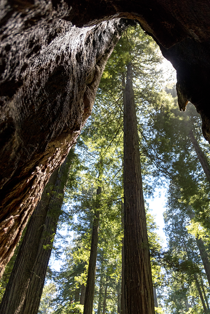 All along the trail were hollowed out trees that seemingly impossibly, were still alive and thriving despite being charred from past forest fires. We ducked in and out of their empty trunks, feeling a bit like we were exploring caves. All the while, we couldn’t escape the ever-present need to look up. Soft ferns covered the forest floor in a lush blanket, but still I kept looking up as though I had no choice in the matter.
