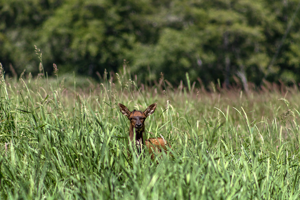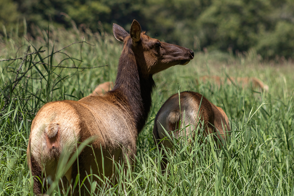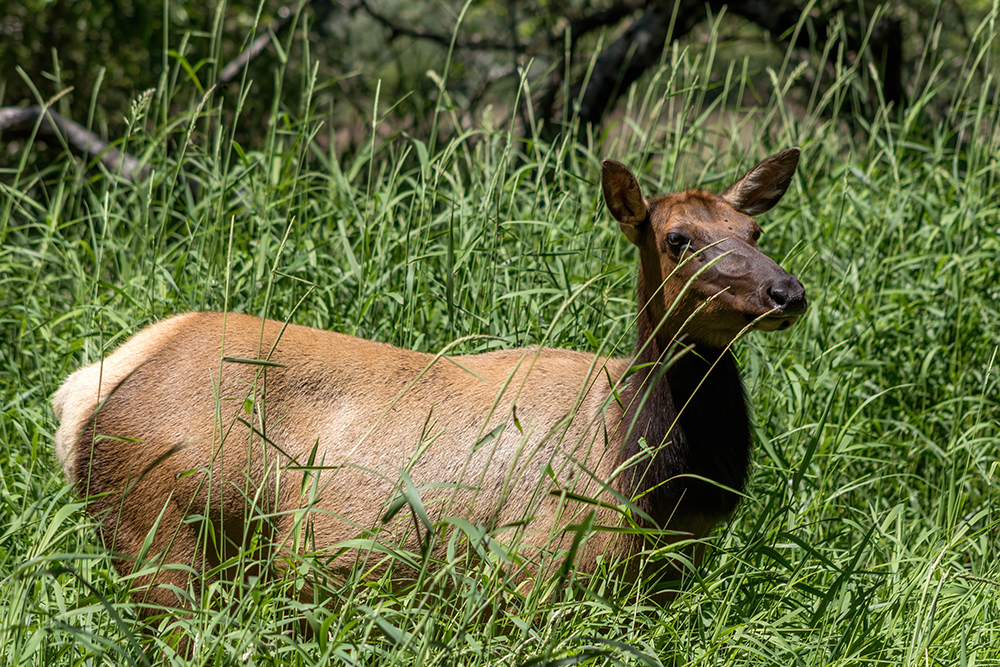 The Lady Bird Johnson Grove Trail is a 1.4 mile flat, easy walk, but we took it so slowly that we were in danger of not finishing our itinerary for the day. When we finally finished up the short loop, we got back in our car and followed road signs until we reached Elk Meadow, where we were immediately halted by the sight of a Roosevelt’s Elk crossing the road.