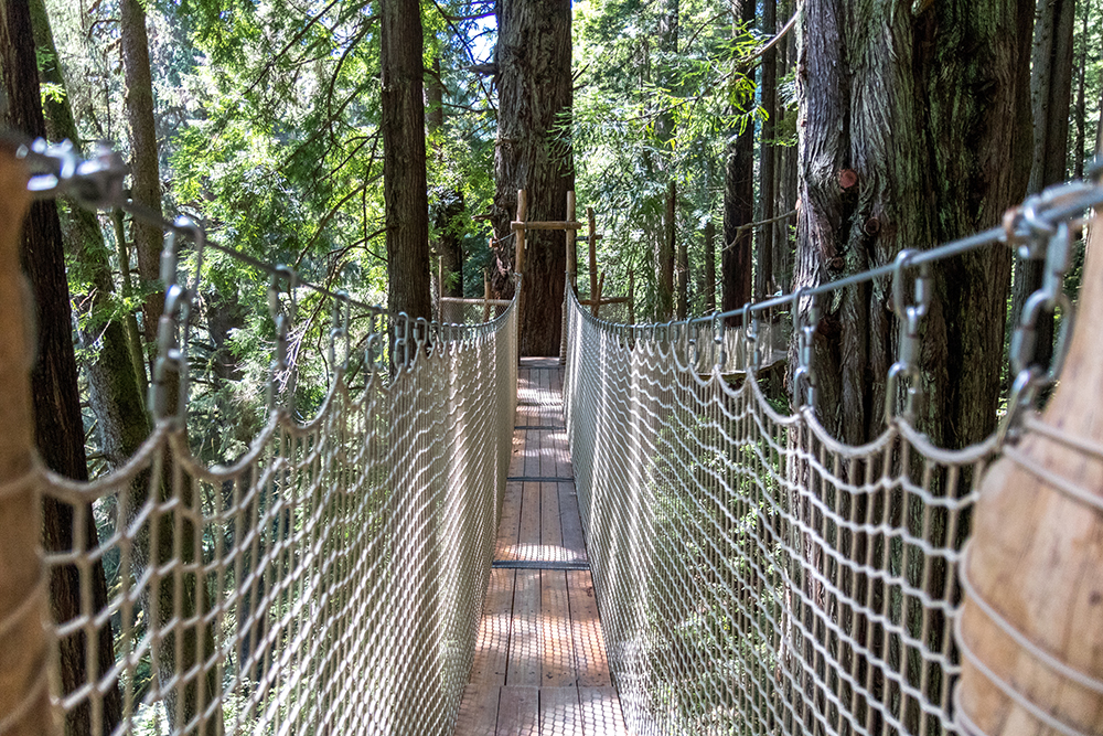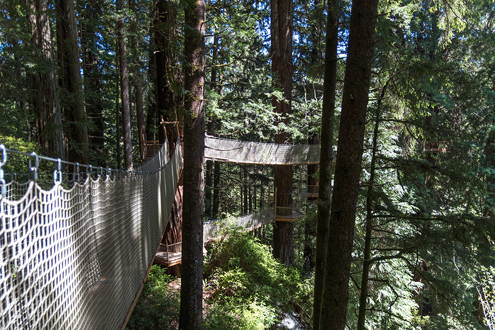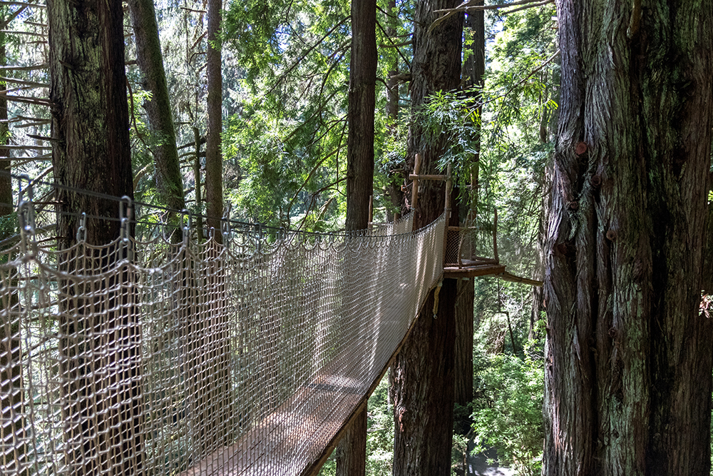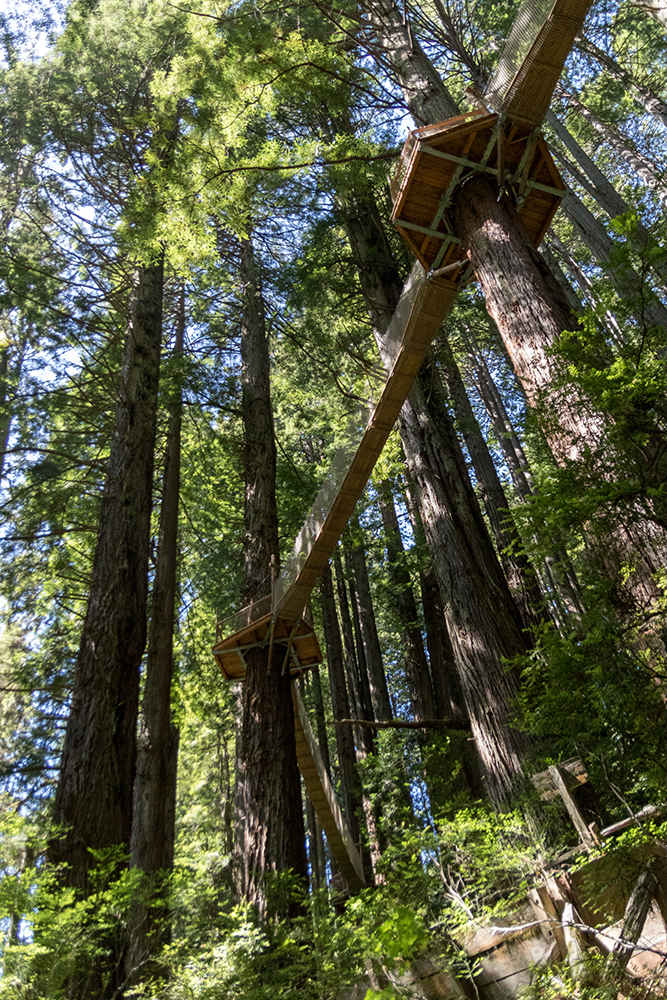 Massive statues of Paul Bunyan and Babe the big blue ox heralded us into the packed parking lot of Trees of Mystery, the self-proclaimed “premier nature attraction on California’s North Coast.” It’s safe to say that we normally don’t find ourselves at roadside attractions like this, but it had that distinctly American hokiness that I sometimes find irresistible. There was only about an hour left until the park closed, so we got right in line for tickets and once inside, went directly to the canopy walk which was made up of eight suspension bridges about 100 feet up in the trees.