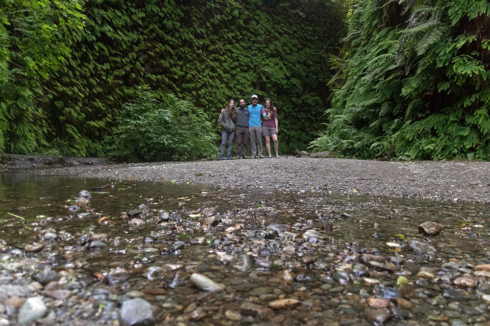 Vince, Jordi, Anthea and I clomped across a wooden plank that spanned the creek bed, rounded a bend, and found what we were looking for. It felt like being transported instantly to a different world where time doesn’t work in quite the same way that it does on earth. One moment we were in a normal forest, wading through a normal stream, and the next we were standing at the bottom of a canyon whose walls were so thoroughly coated in ferns that it was impossible to see the earth underneath them. My mind was reeling, conjuring up images of some long-slumbering green man that had been lying dormant for centuries. Biomass had piled up and grown over him as the world changed, and still he slept, his giant legs becoming what we now see as canyon walls. The forest wanted him to wake back up, almost as if it was waiting to exhale a long-ago held breath of anticipation.