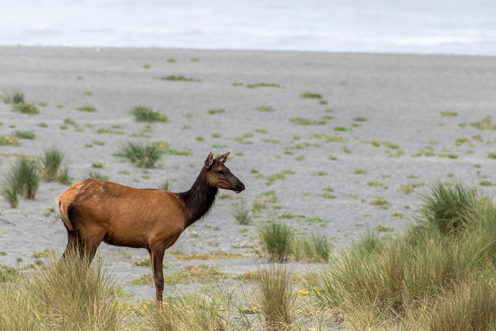 We wandered aimless along the shore, eventually circling back to the parking lot where we got in the car and planned to drive away. Almost immediately upon getting back on the road, we saw a large herd of Roosevelt’s Elk wading through dune grass. Vince pulled over to the shoulder and we got out to watch the elk as they grazed, and frolicked in a little stream of water. I had never seen elk on the beach before, so this was a happy surprise.