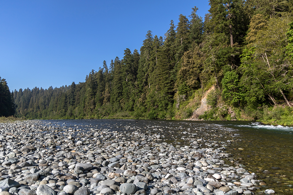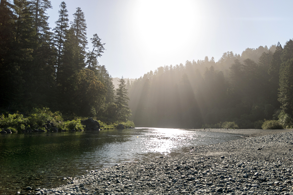 We stopped at the Jedediah Smith Campground and wandered onto a rocky beach on the bank of the aqua colored Smith River. The gorgeous sunlight that had welcomed us into the park was still streaking down above the trees that lined the river, and although it seemed like the water should be bone-chillingly cold, it was somehow just pleasantly cool on our feet as we waded into its clear water.