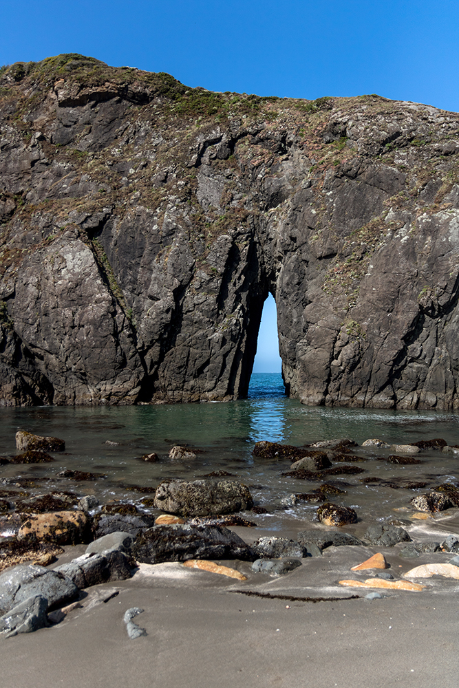Once the crayfish was out of sight, we decided to get back on the road. Our next stop was across the state line back Oregon at Harris Beach State Park. Our friends, Meagan and Travis, had gone tidepooling there the previous week, but we weren’t lucky enough to visit anywhere near low tide. We still stopped to check out the cool rock formations just off shore, and stretch our legs a bit. I wasn’t too disappointed about the timing because we’d already had one tide adventure on our trip, and the beach was definitely still worth a stop. I especially liked an arch rock that sat in shallow water. Whenever a wave hit it, we could see the water surging through the arch and rushing towards our feet in a mesmerizing rhythm.