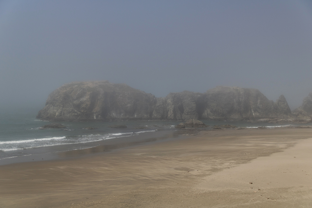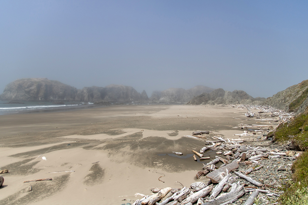 A tall staircase with a series of look out decks led down to the beach, and from our high vantage point, we could see ribbons of sand swirling across the landscape below. The sky was a gray-blue haze that made some far-off sea stacks look fuzzy.