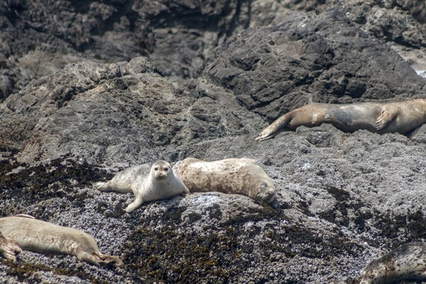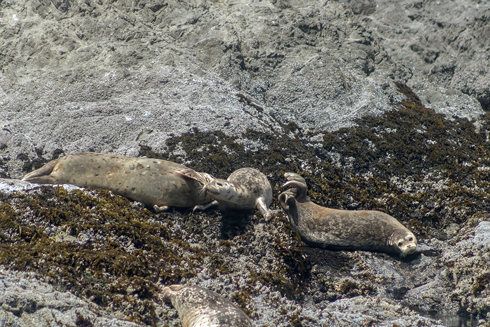 For the most part, the seals were interested only in sleeping, but a few of them wiggled around on the rocks coming in and out of the water, and another couple floated in the cove, their heads bobbing up and down. Harbor seals have adorable, almost puppy-like faces that contrast with their blobbish bodies that are completely ill-suited for moving on land. As they flopped around trying to move on the rocks, it was obvious that this was an animal that had invested heavily in optimizing for an aquatic lifestyle.
