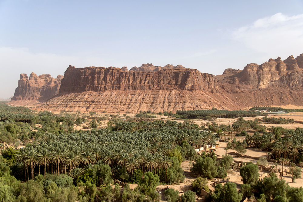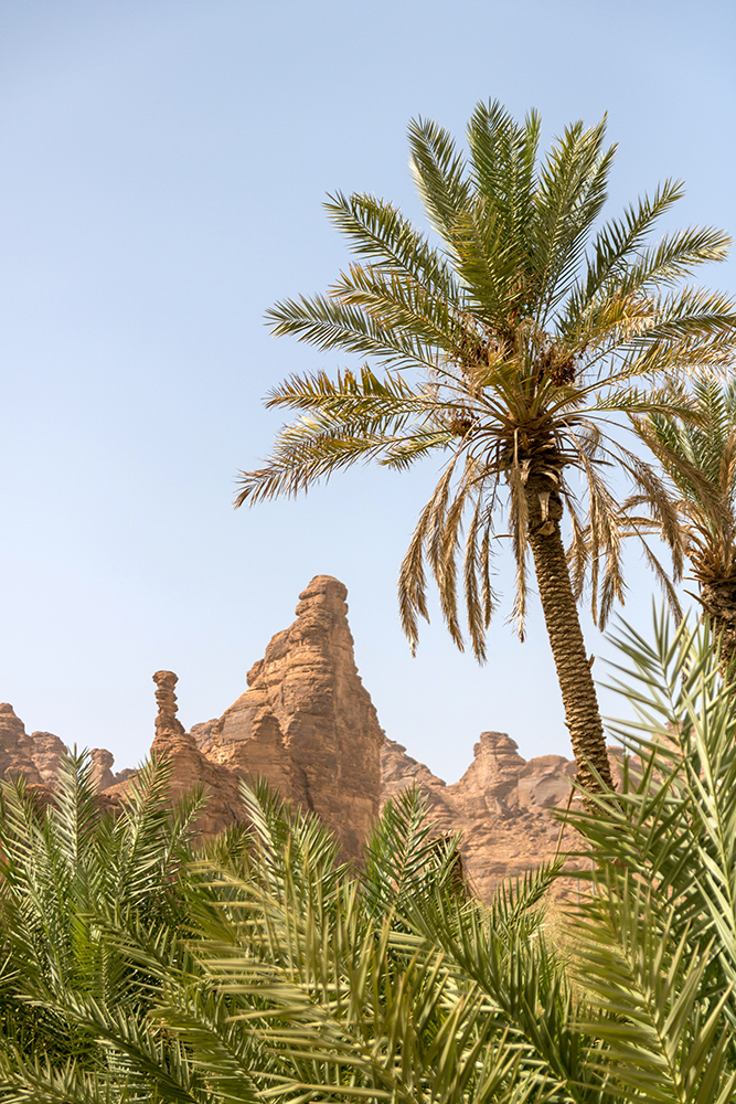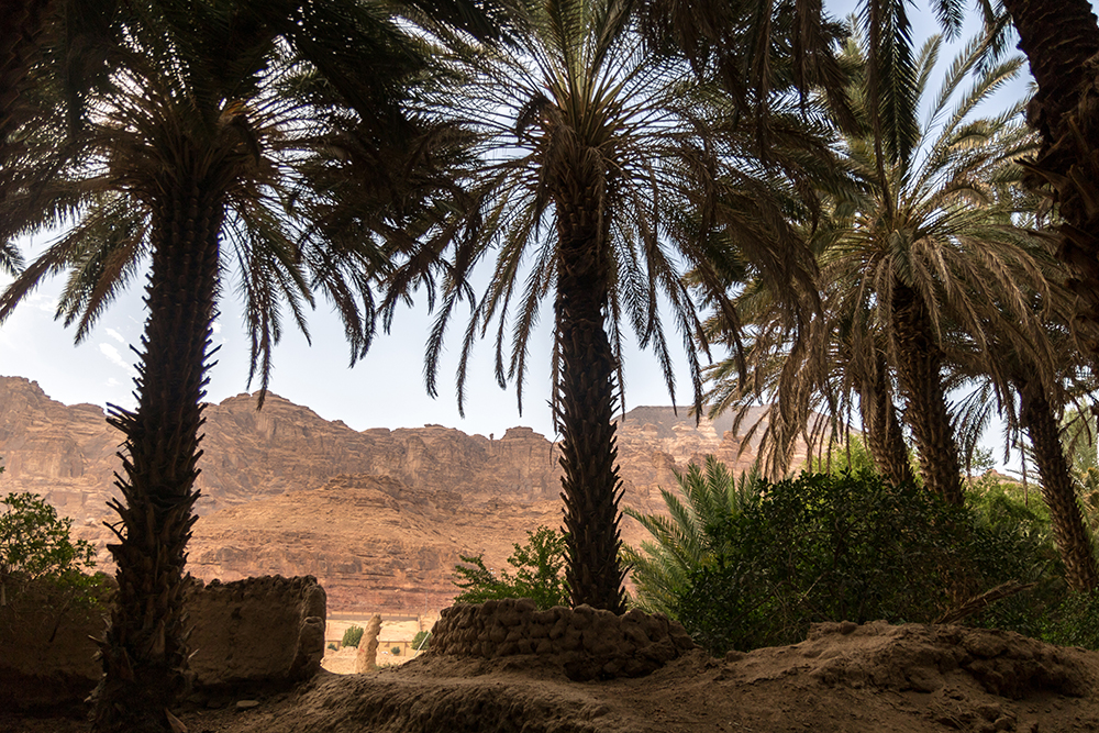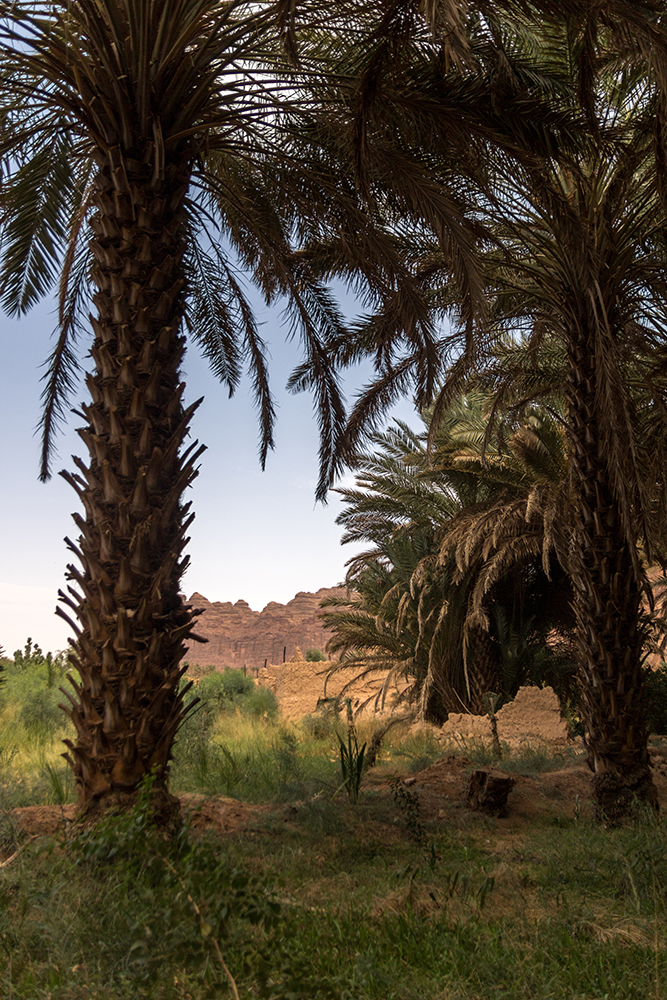 It was late morning now, but our flight out of Al-‘Ula wouldn’t take off until that evening, so we made a quick plan for how to spend the rest of our day, first heading back to the Sahary to relax a bit before check out. We packed, and then hung out in their tea room for an hour or so, searching the internet for ways to fill the rest of the day. Vince found some spots where we could try to park and wander into a palm forest, and a short hike on the outskirts of the city. Then we loaded all of our luggage into the rental car, and set out on our mission to look at palm trees.