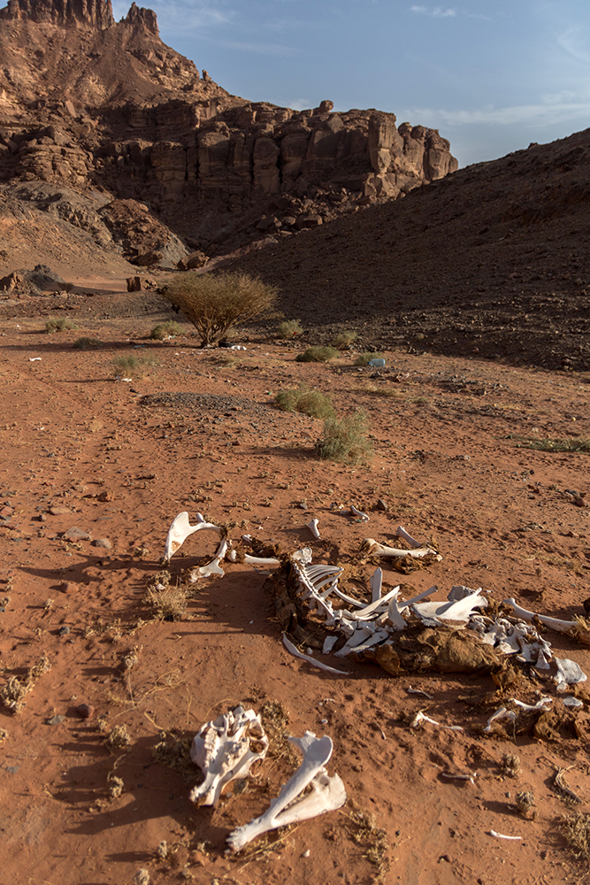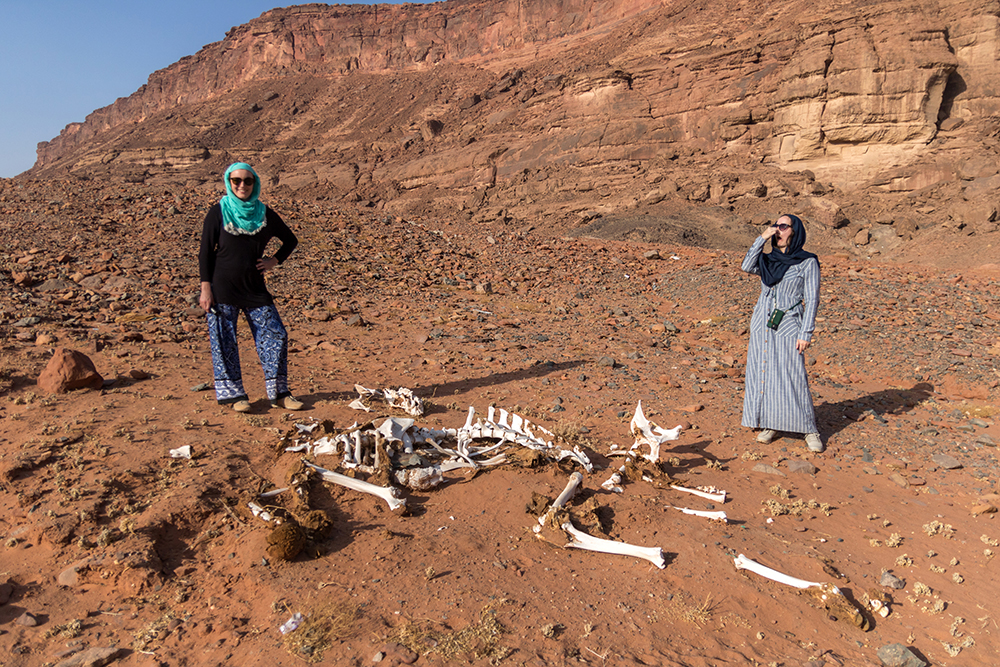 His search took us through a small neighborhood where stray dogs roamed the dirt roads and goats bleated from their fenced-in yards. Despite all of the animals roaming around, we didn’t see a single person outside of their homes. The neighborhood ended abruptly, giving way to a vast expanse of unforgiving looking desert canyons. A veritable graveyard of animal remains in various states of decay created a somewhat ominous atmosphere as we stepped out of the car and onto the sand.
