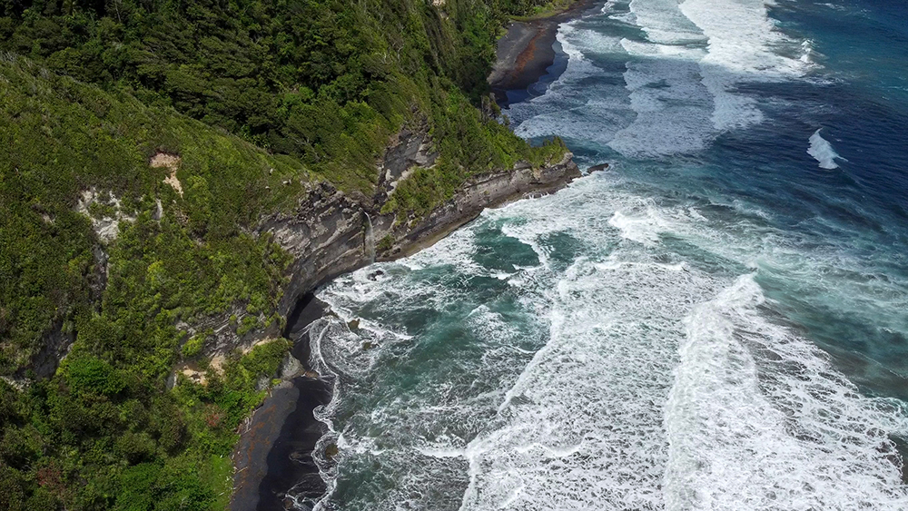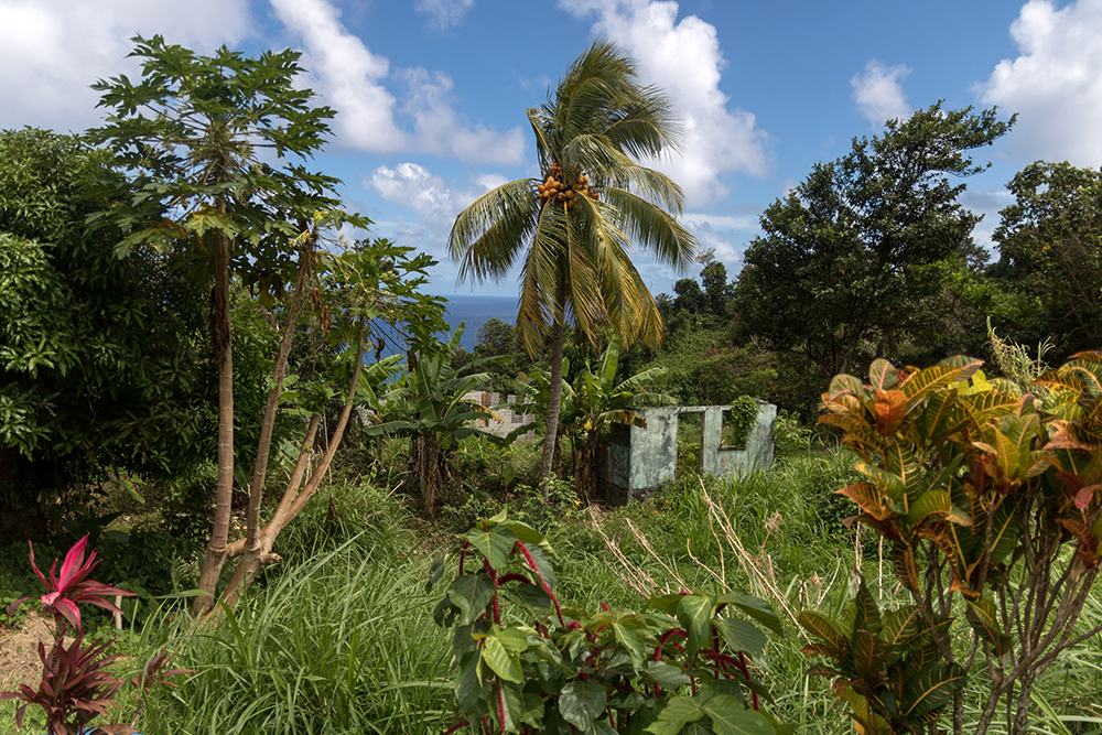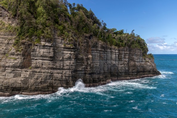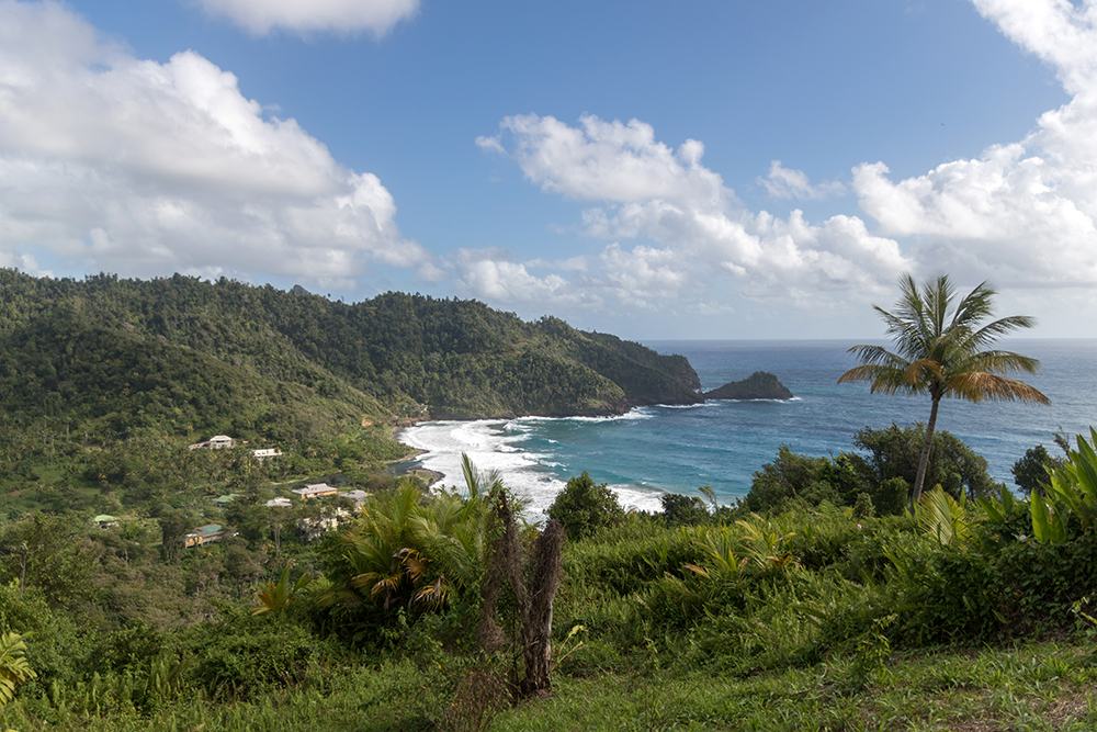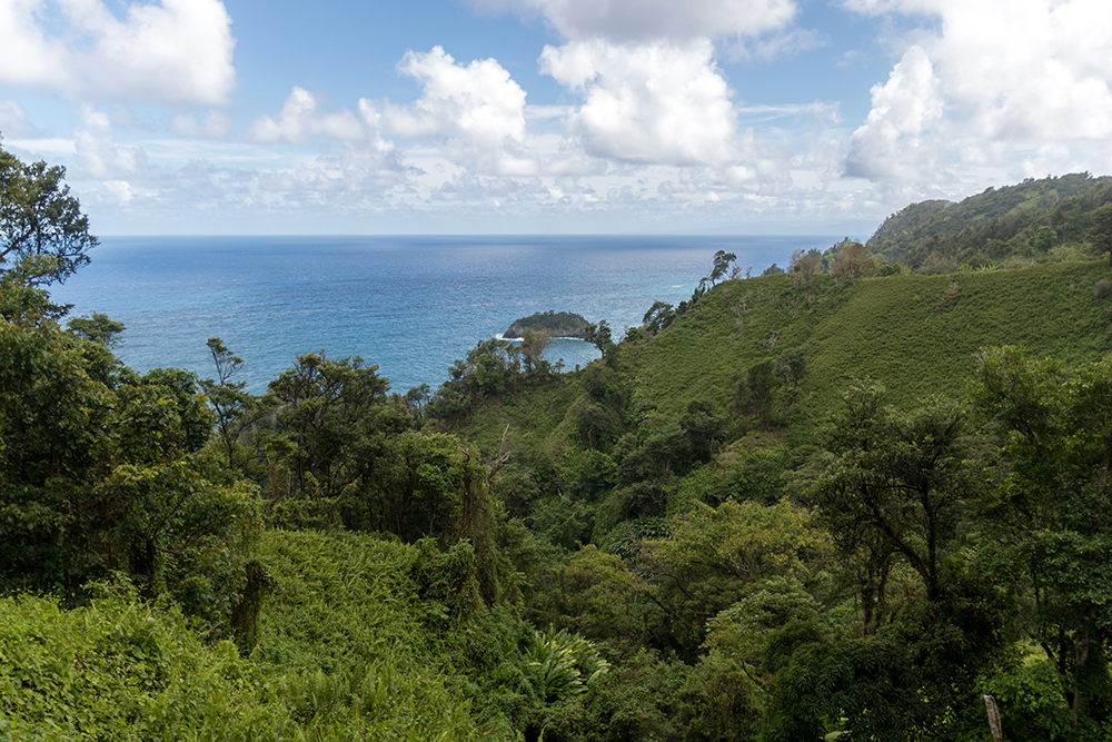 This was our first of two free days of this trip, so we were in no rush when we finally left the Ramelton and drove out to Dominica’s rugged Atlantic Coast. Our goal for the day was to find Wavine Cyrique, a waterfall that tumbles over a tall cliff to meet the waiting ocean waves on a black-sand beach below. We were about to discover just how tricky it can be to locate some of Dominica’s more remote points of interest. Although we had read reports of how to find the waterfall online, we still wound up taking a wrong trailhead at first. It wasn’t until we wandered into a pasture full of goats and lost the trail entirely that we realized we were in the wrong place. The wrong place still had quite a beautiful view down to Rosalie Bay though.