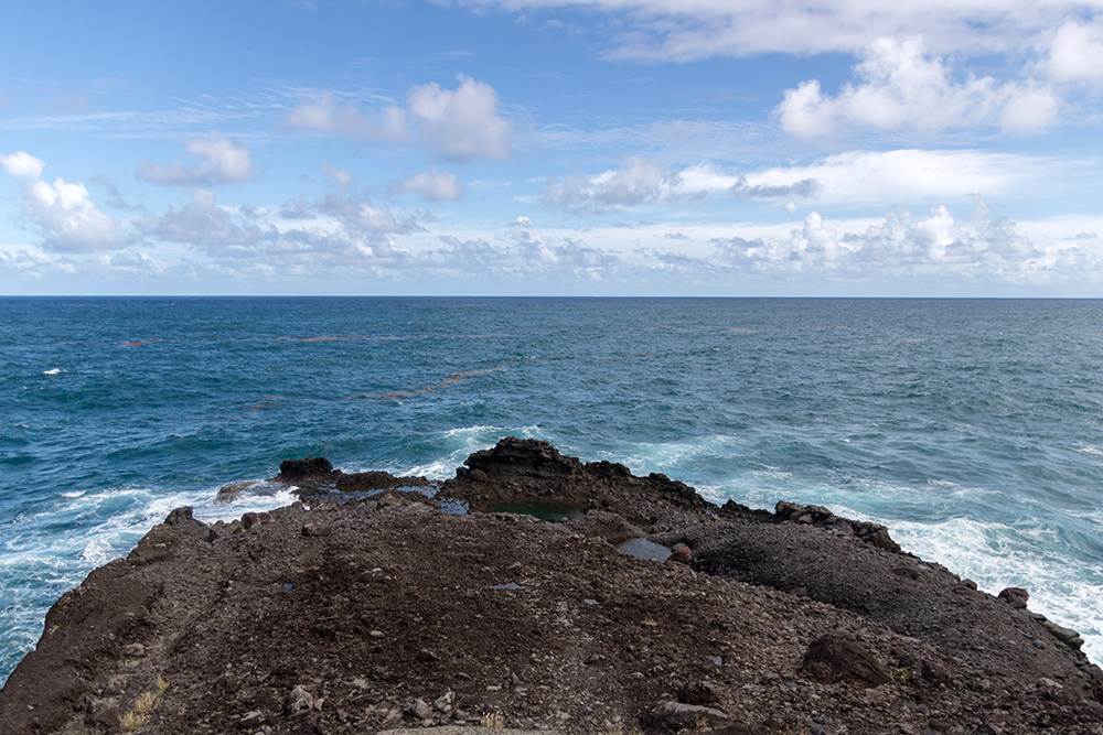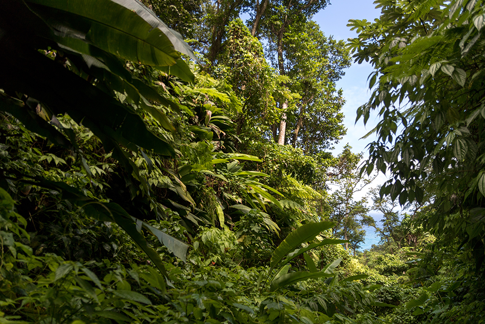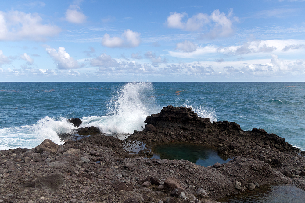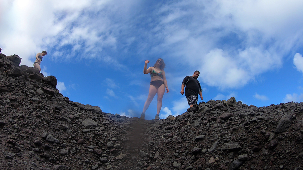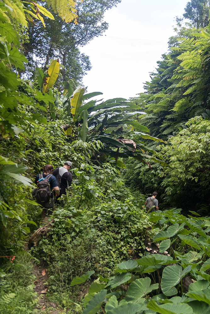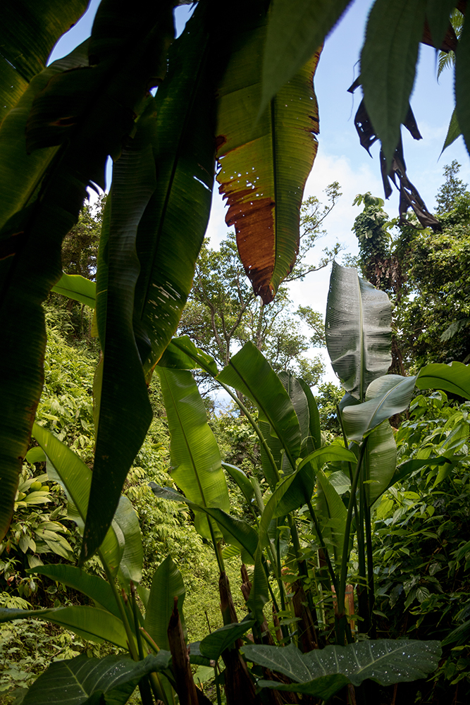 The canyoning guide had recommended that we hike to Glasse Point, which was a coastal area with volcanic pools that we could swim in if the waves weren’t too big when we got there. This trailhead was clearly marked so we didn’t have any trouble finding it, and we began our descent through a thick jungle as hummingbirds zipped along eating from flowering trees near the trail. We stopped several times just to ogle at monstrous, leafy plants before even making it within sight of the shore.