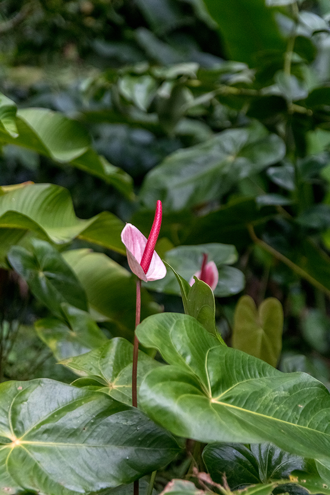 Practically every other foreigner we’d met so far, and most of the locals had asked us if we planned to go see Trafalgar, so we knew it was a popular place to stop, but when we pulled into its huge carpark, there was only one other car in sight. Bright flowers lined the well-paved trail, and little lizards scurried out of our path as we took a short hike uphill through the rainforest. Heavy rain started pelting down on us as we walked, and we waited a few minutes for it to subside, sheltering under some big leaves that hung over the trail.
