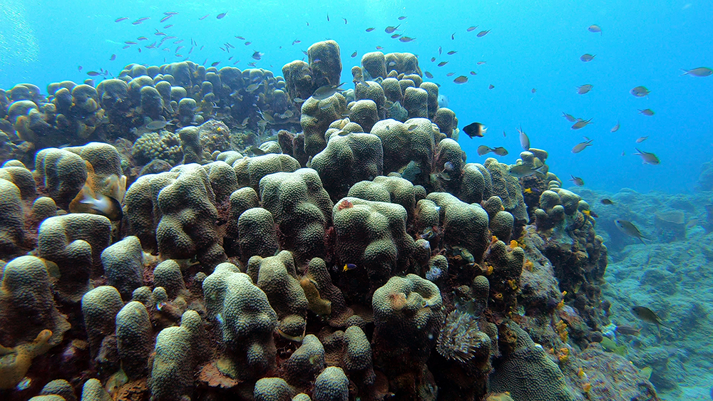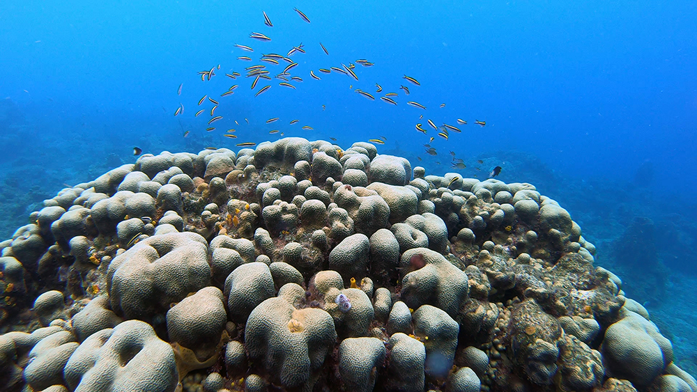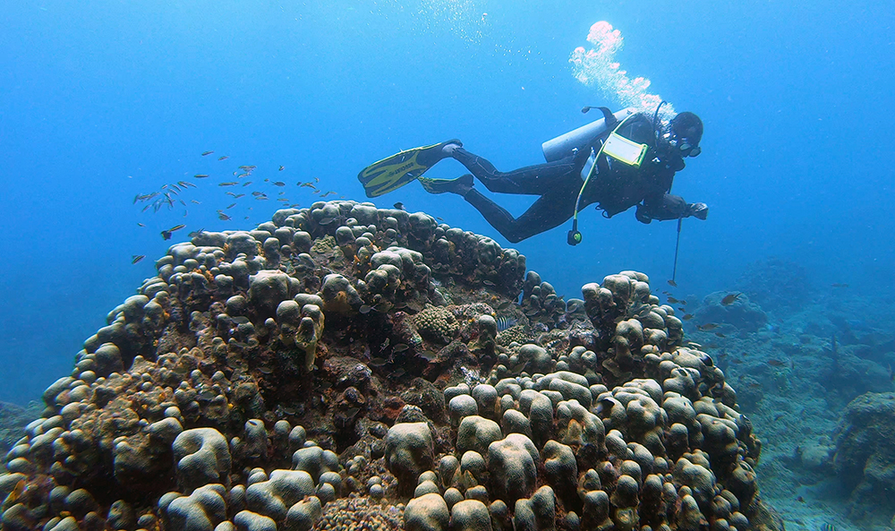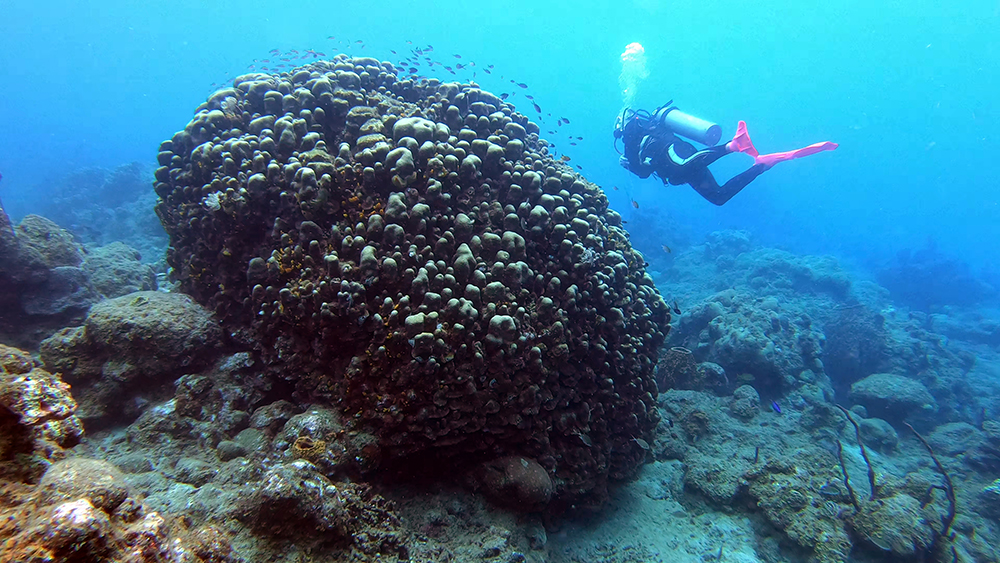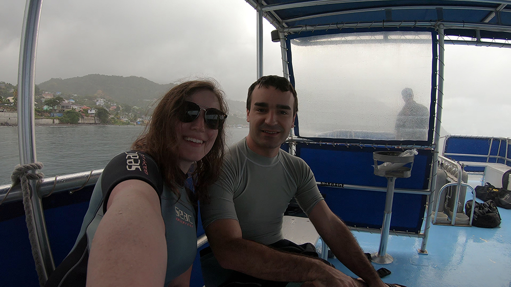Bonnie and Rachel were signed up for a discover scuba dive course, which would be done right there at the hotel, but Vince and I had opted to join a boat dive. The boat showed up right as we had finished getting our rental gear sorted, so there was no wait at all before we were off. It was a simultaneously sunny and rainy morning and a double rainbow followed all the way to our first dive sight which was off the volcanic shores at the southernmost tip of the island.