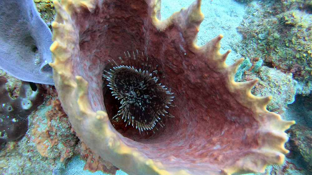 We jumped into the water at a site called La Bin, where we dove along a massive coral wall that dropped off into what looked like a bottomless abyss. The reef was covered in giant, bright red barrel sponges, something I’d never encountered before to my memory. I felt compelled to look inside all of the barrel sponges I swam by, just to see if there was anything interesting hanging out inside of them. This yielded a plethora of tube worms and fire worms, a brittle star, and a basket star. I also found two spotted moray eels and a stonefish, but the best find on the dive was a seahorse.