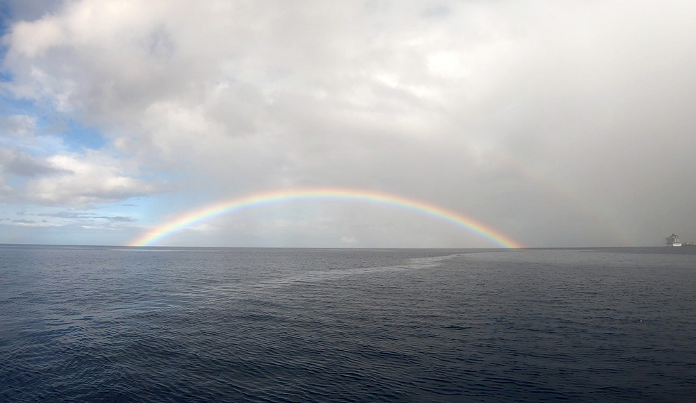 Bonnie and Rachel were signed up for a discover scuba dive course, which would be done right there at the hotel, but Vince and I had opted to join a boat dive. The boat showed up right as we had finished getting our rental gear sorted, so there was no wait at all before we were off. It was a simultaneously sunny and rainy morning and a double rainbow followed all the way to our first dive sight which was off the volcanic shores at the southernmost tip of the island.
