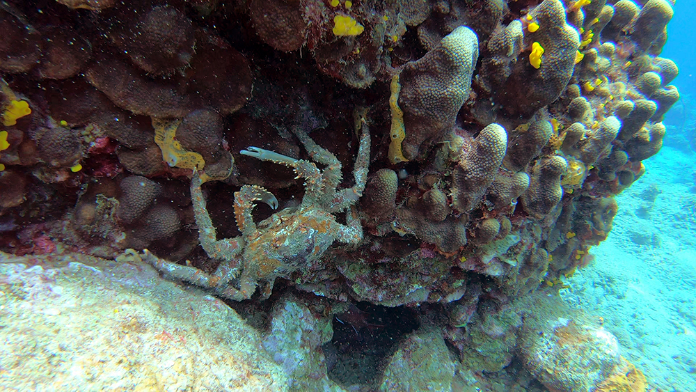 This second dive at Point Denad had the now familiar array if sponges, but we saw more hard coral which was home to schools of tiny fish and even massive king crabs.