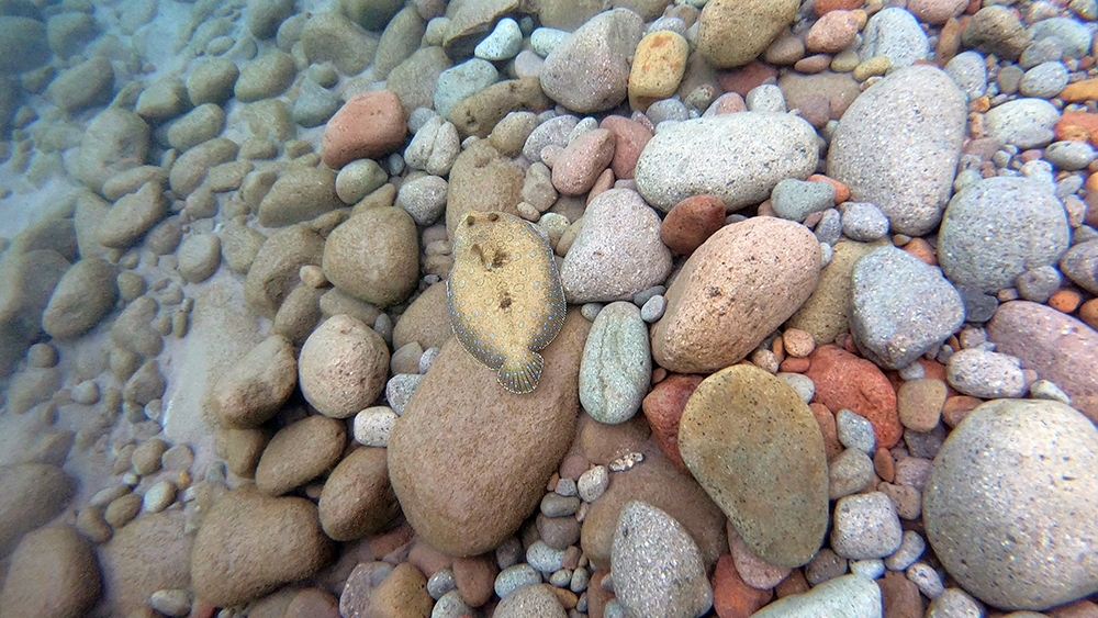 Just as we were stepping into the water to begin our snorkel, Kerry spotted a flounder amongst some colorful rocks in the shallows. I quickly pulled my mask over my eyes and slipped into the water to see the flat fish skimming along the sea floor. This was definitely a promising start to the morning.