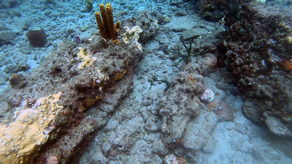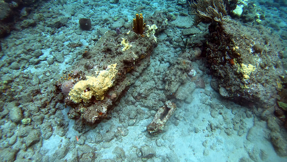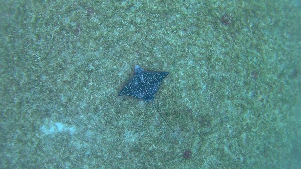As it happened, the ship that the canons had come from was wrecked nearby, and even though the visibility wasn’t ideal, Kerry was still willing to take us out to see if we could find it. Along the way, he spotted a spotted eagle ray (I know, sorry). It took me a few seconds to see it through the hazy water, but eventually my focus locked on the otherworldly creature seemingly flying above the ocean floor. Kerry took my GoPro down closer to the graceful ray.