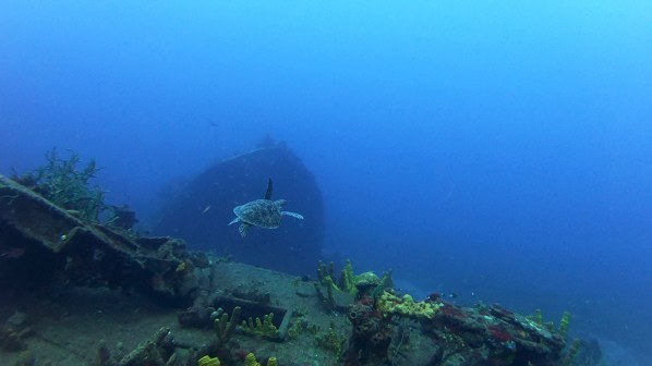 Further out to sea, we finally saw a couple of huge dark shapes far below us. The ship was broken in two pieces, and we could see its shadowy outline through a deep, blue expanse. Kerry offered to take my GoPro down once again, but when he’d gotten about halfway to the ship, he resurfaced and excitedly told us that he could see a turtle, and to be on the lookout for it to move as he approached it. Then he dipped back underwater and dived all the way down to the wreck. I couldn’t see the turtle until it moved, swimming over the wreck.