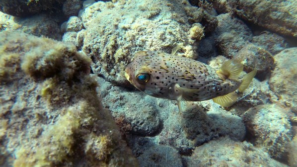 When we reached the isthmus, we grabbed our masks and snorkels from the trunk, and jumped into the water on the Caribbean side to see what we could see. The reef here was rocky and we had to be careful because it was covered in urchins, but we ended up seeing several puffer fish with iridescent, blue eyes.