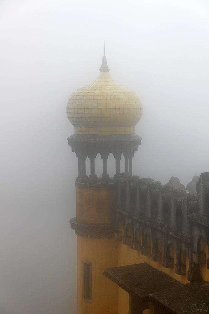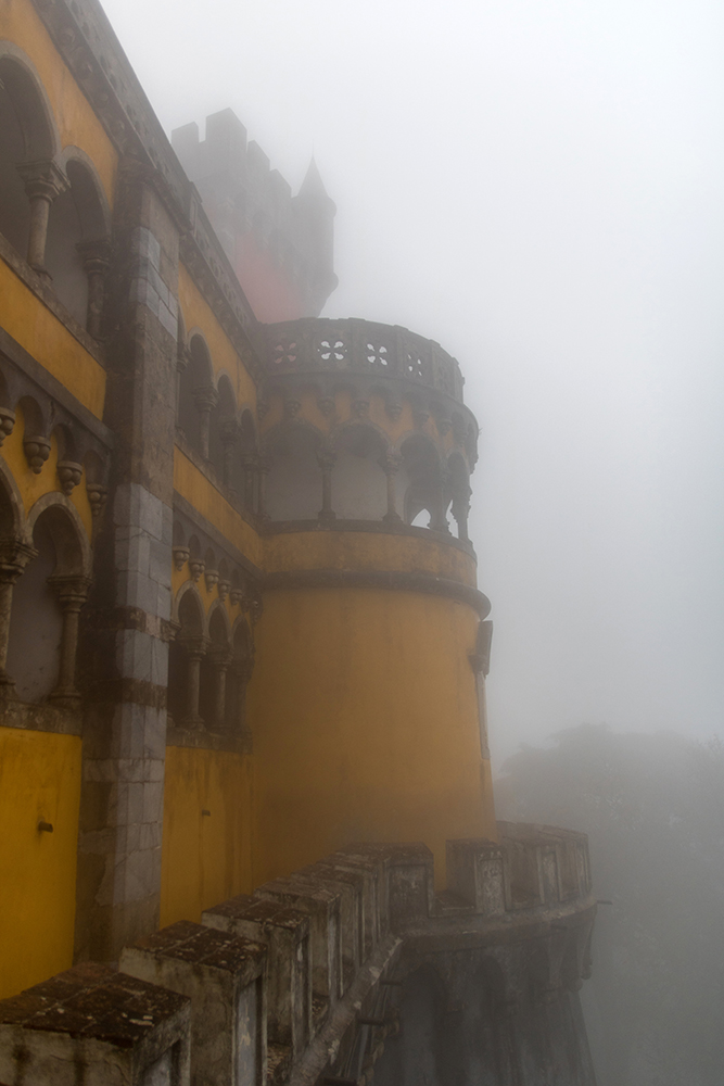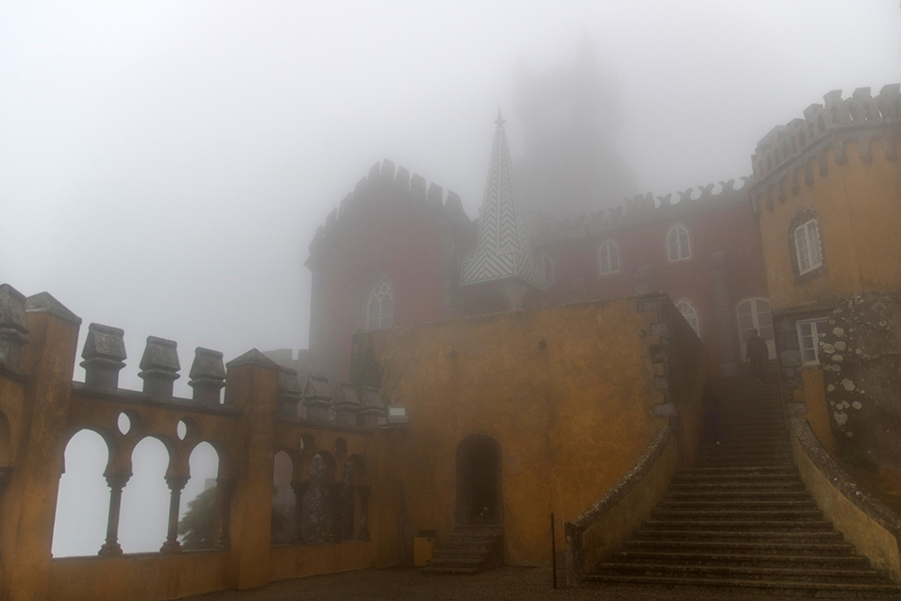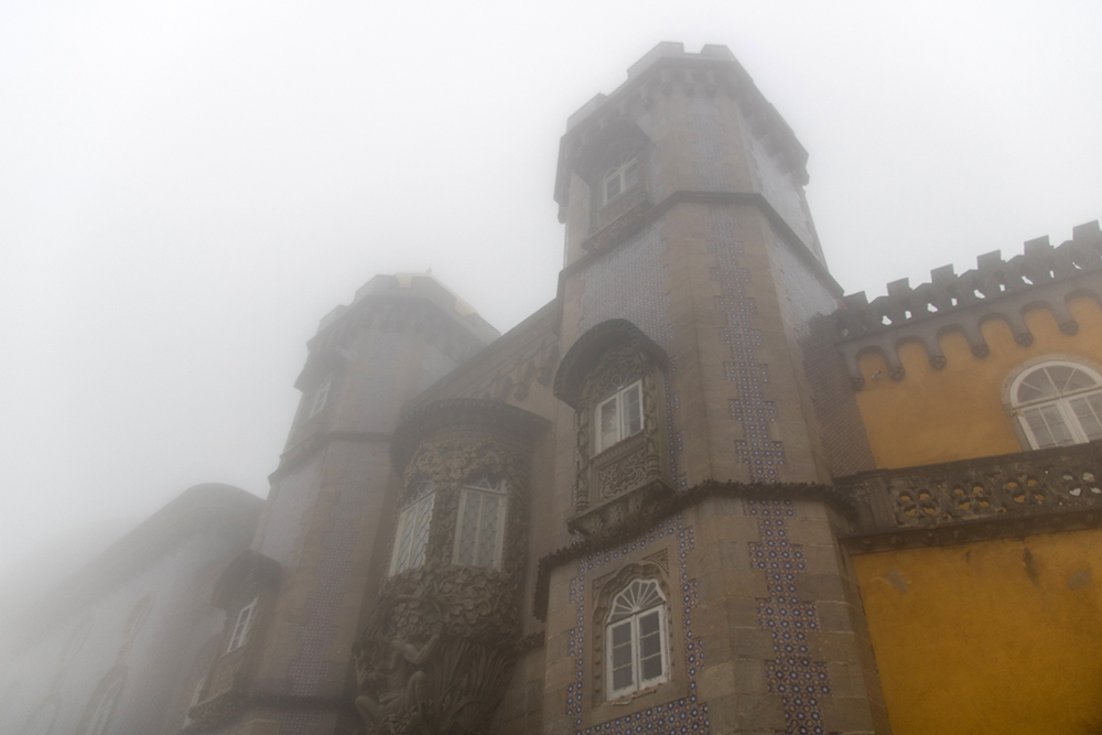 Thick fog cradled the top of the mountain in a frigid embrace, impenetrable by the sun’s warm rays. I could just make out a shadow of the imposing walls of Palácio da Pena looming behind the gray curtain. On a clear day, this colorful palace would look vibrant and inviting, but on this day it was eerie and foreboding. An icy wind sent a chill through my body and I pulled up the hood of my raincoat. Moisture had already condensed onto my eyelashes, adding a hazy filter to my vision that complimented the thick atmosphere. One was certain: This was not how I’d envisioned our visit to Pena Palace.