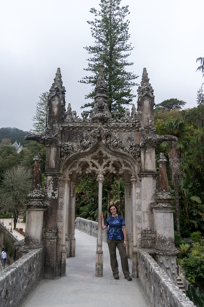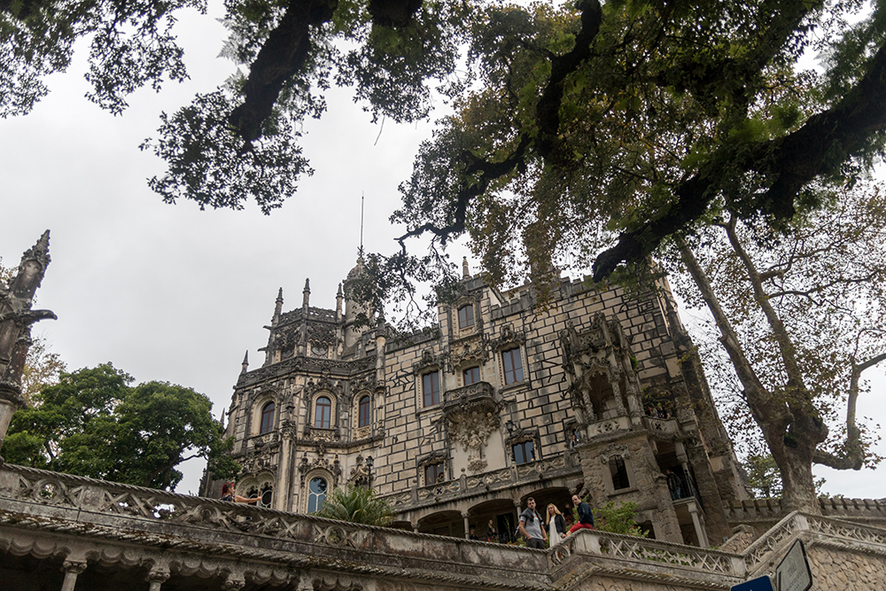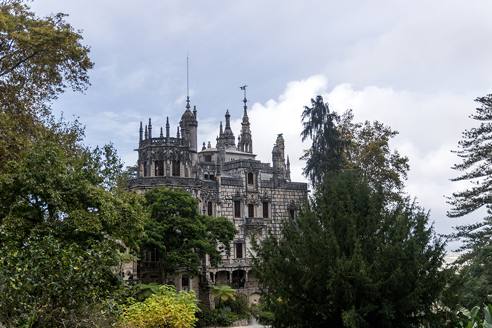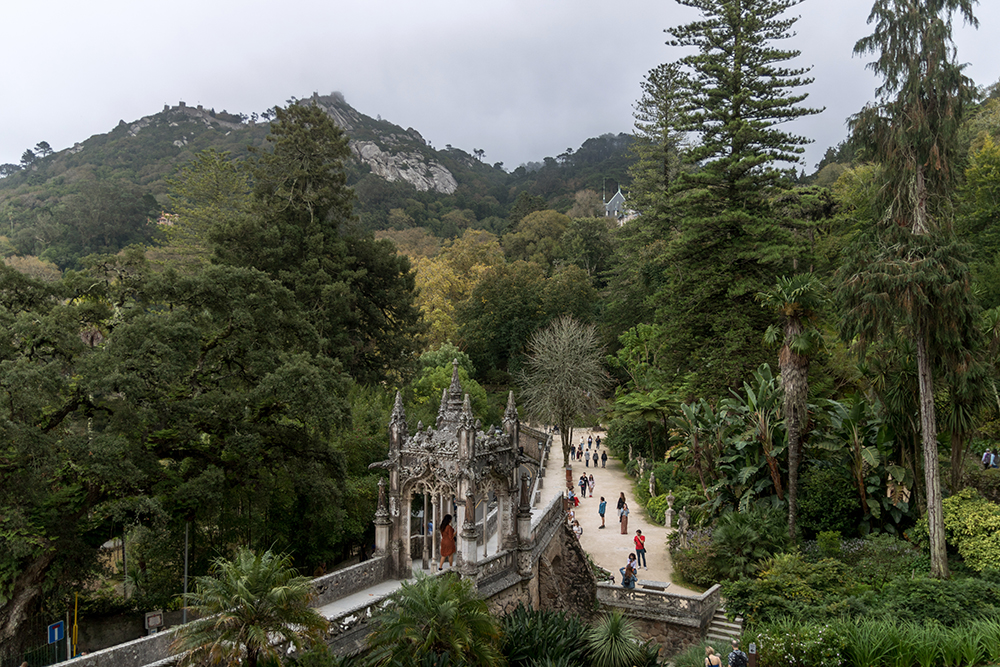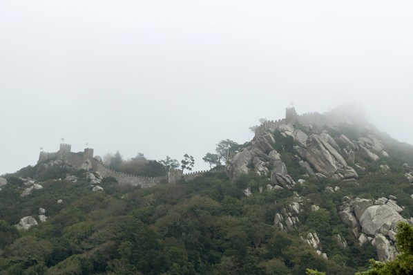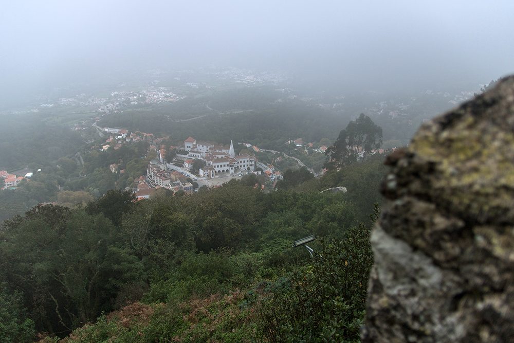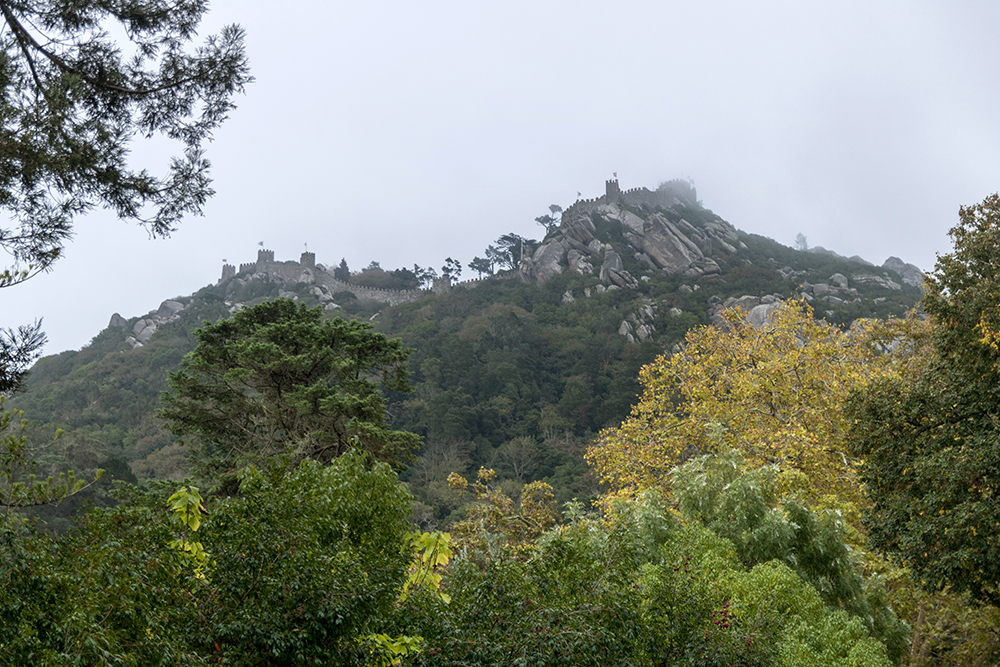 Once we’d resurfaced above ground, Vince and I explored more of the garden’s maze and finally entered the Regaleira Palace, an ornate structure with beautiful stonework. There weren’t many rooms open to the public inside, but as we exited we noticed that the fog on the mountaintop had lifted enough to reveal a medieval castle whose stone walls blended in so well with the rocky ridge line that it looked like it could have grown out of it.
