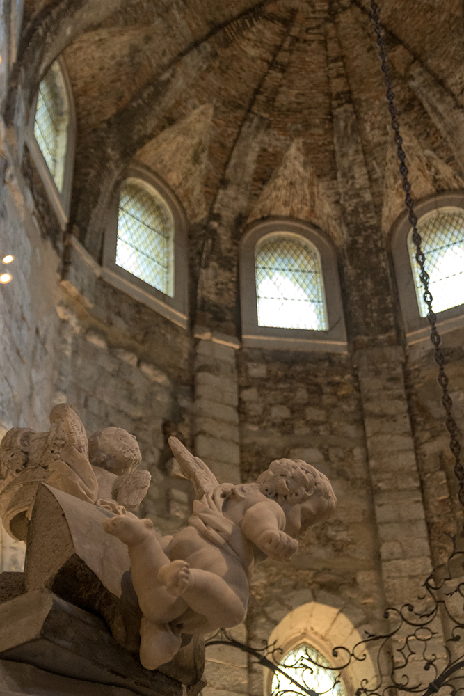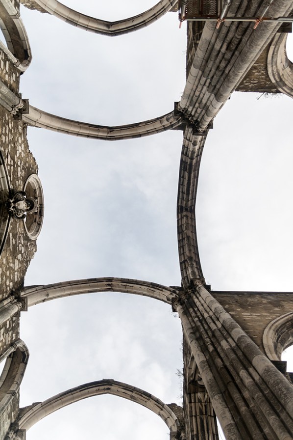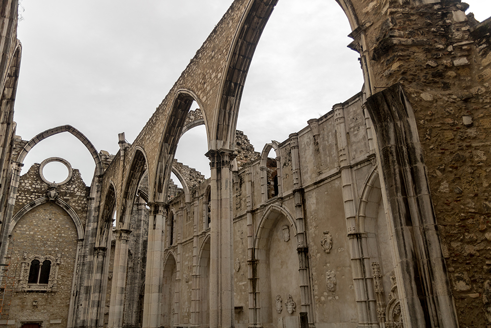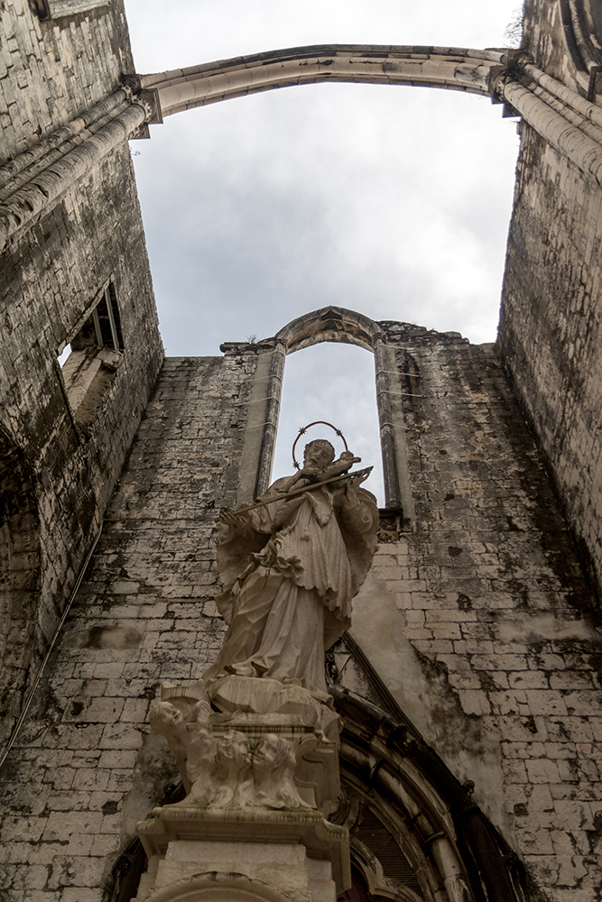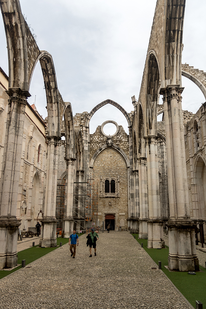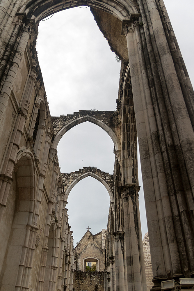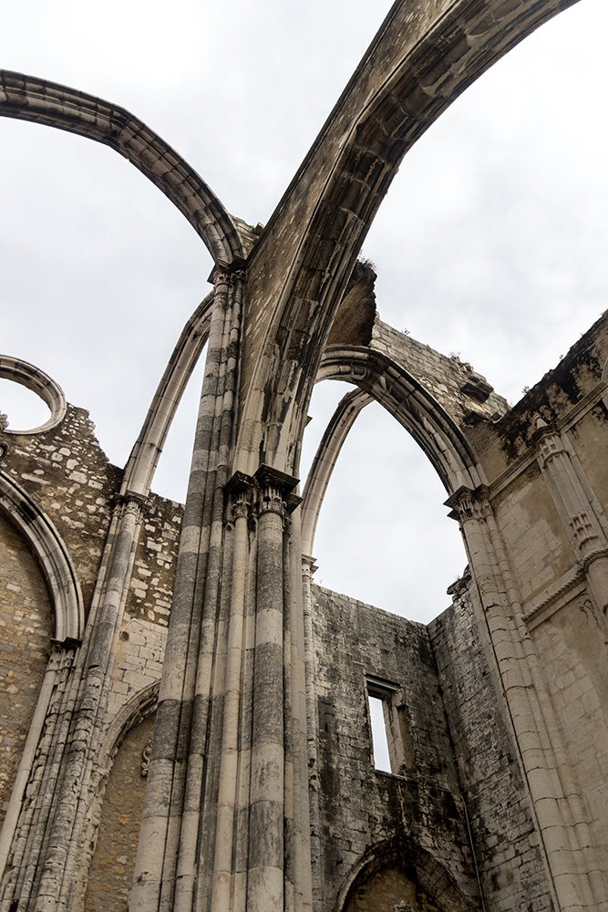 Our bus was waiting to take us back to Lisbon when we finally left Jerónimos Monastery. This would be our last evening in the city, and Vince, Jared, Rachel, and I had a few more places we wanted to see before our flight the next morning. We started with another Catholic site, the Carmo Convent, which was just a couple of blocks away from our hotel. We climbed up a set of steep steps, bypassing the Santa Justa lift, and easily found the entrance doors where we payed a small admission fee to enter the site. The Carmo Convent, which was founded in 1389, was later destroyed in the earthquake of 1755. Its skeletal remains now stand as an archeological museum, and there was a definite feeling of strangeness as we strode through the ruined structure, finding only brooding clouds where the ceiling should be.