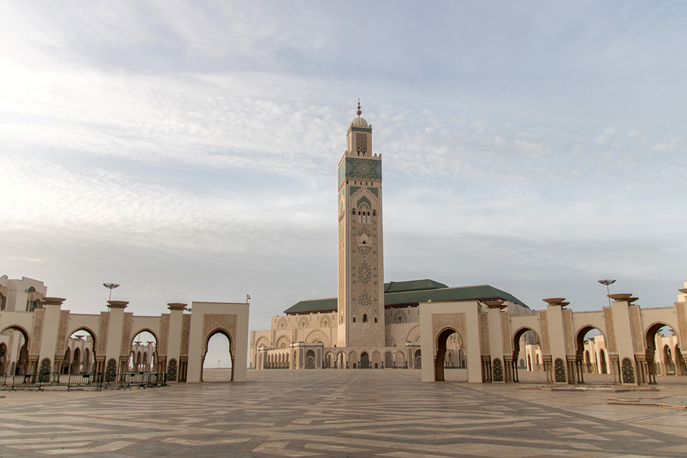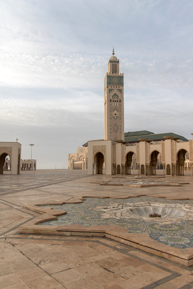 I stepped down from a fifty passenger bus, my feet connecting with the pavement of a busy street in the heart of Casablanca, Morocco. Dusk was approaching quickly and an atmosphere of sea salt filtered the late afternoon sunlight into a glow that cast a lovely, soft light onto the mosque that we’d ventured into the city to see. Casablanca was just a short stop on our way to Marrakech, but most of the Percussive group had opted to leave the airport during our layover to at least get a glimpse of Morocco’s largest city.