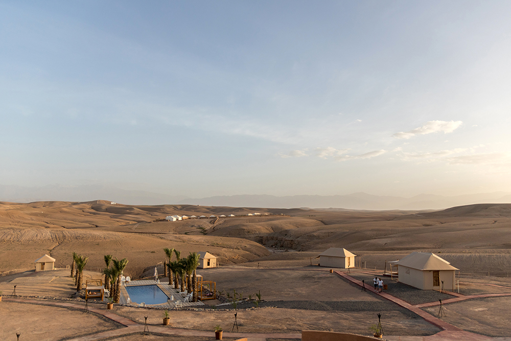 Back at the Hotel Akabar, those of us covered in dust had barely enough time to try to make ourselves presentable for a sunset dinner at the Agafay Desert Luxury Camp. Vince and I changed into clean outfits, and I touched up my makeup, then we barreled back downstairs to the lobby where most of the group was ready to board another bus. We all climbed inside and we were off, headed back into the desert. I managed another bus nap as we ambled along, which gave me a nice boost of energy when we finally arrived at the five-star glamping resort.
