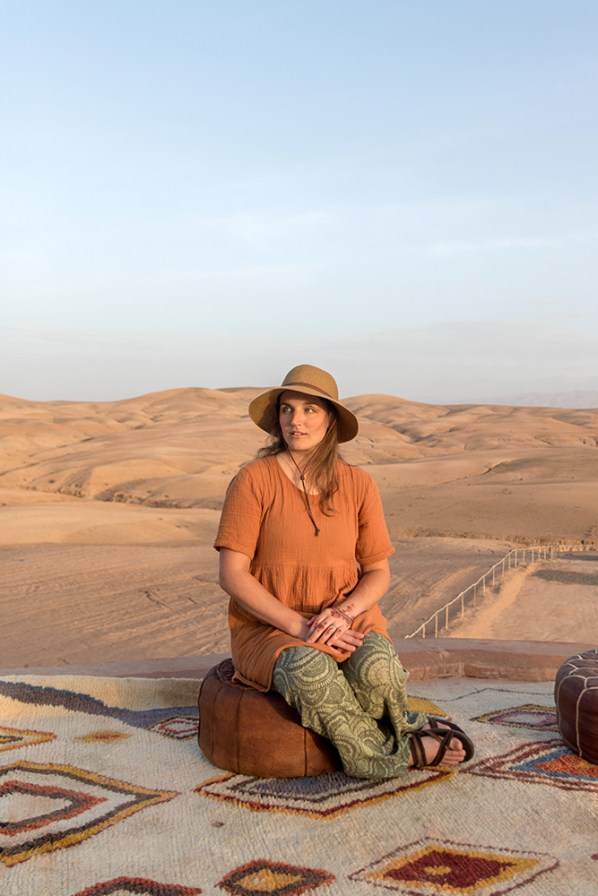 It was truly remote, the only view for miles in any direction being yellow sandy hills. We walked up a rainbow staircase to a hilltop restaurant that provided a view of the expansive desert, and the distant Atlas Mountains. There were plenty of poofs to lounge on as we watched the sun go down and sipped mint tea.