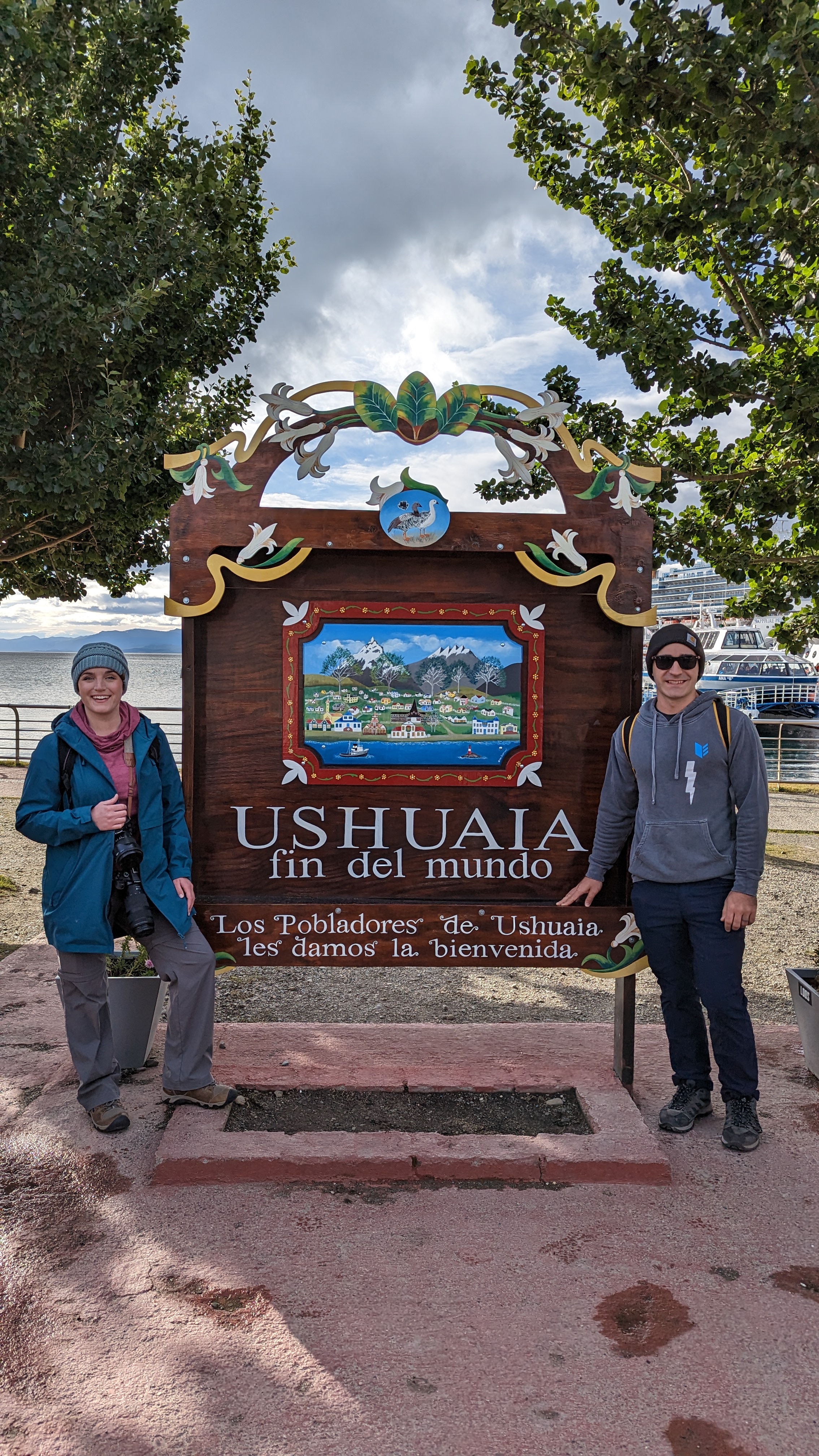 Within an hour or so, the captain announced that we were free to leave the ship, and Vince and I were among the first group of passengers to step onto the pier and make our way into the town, which hadn’t quite woken up for the day yet. We had several unplanned hours before we would join the rest of our group for a tour of Tierra del Fuego National Park, and I wanted to try to find something to fill the time. Right at the end of the pier, we encountered a park full of little kiosks run by tour companies, but only a couple of them were actually open. One had a long line that had formed, spilling out of the little building and across the park, but another one was relatively empty so we ducked inside to see what they had on offer.