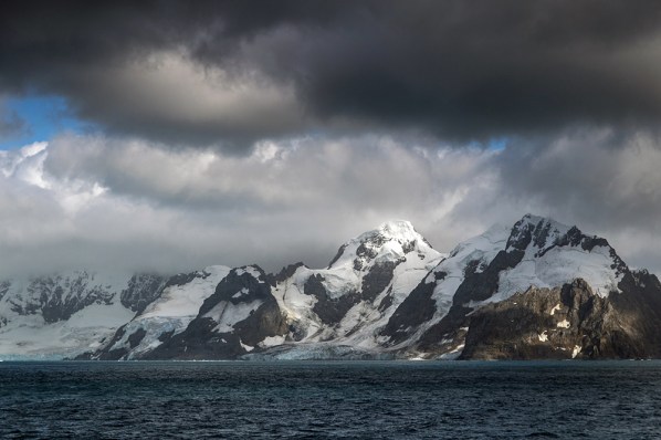 That day I woke up, feeling somewhat more trepidation. Either we would get one more crack at seeing Elephant Island, or we’d be sailing straight into the Drake, without so much as a goodbye to the frozen continent. To my great relief, my peek outside of our stateroom window revealed (to my great surprise) blue skies. That was all I needed to see to set me on a frenzy to get dressed. Vince jumped out of bed alongside me and we were shivering on the Sapphire Princess’s bow within a half hour. This time, although miles away, we could see the silhouette of Elephant Island clearly, the exact vista we’d all been hoping for on our first day in Antarctica.