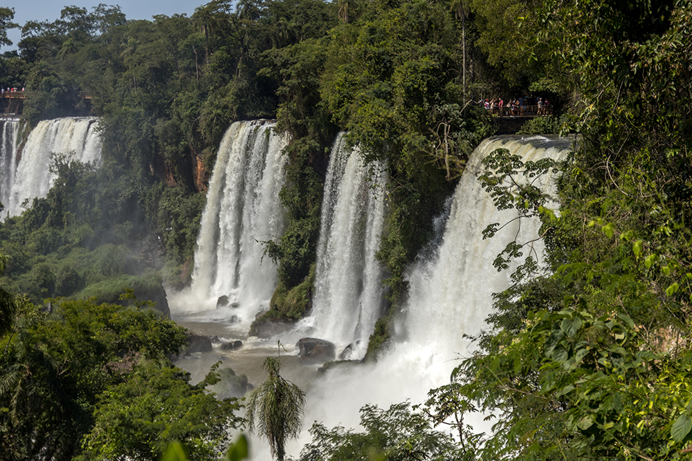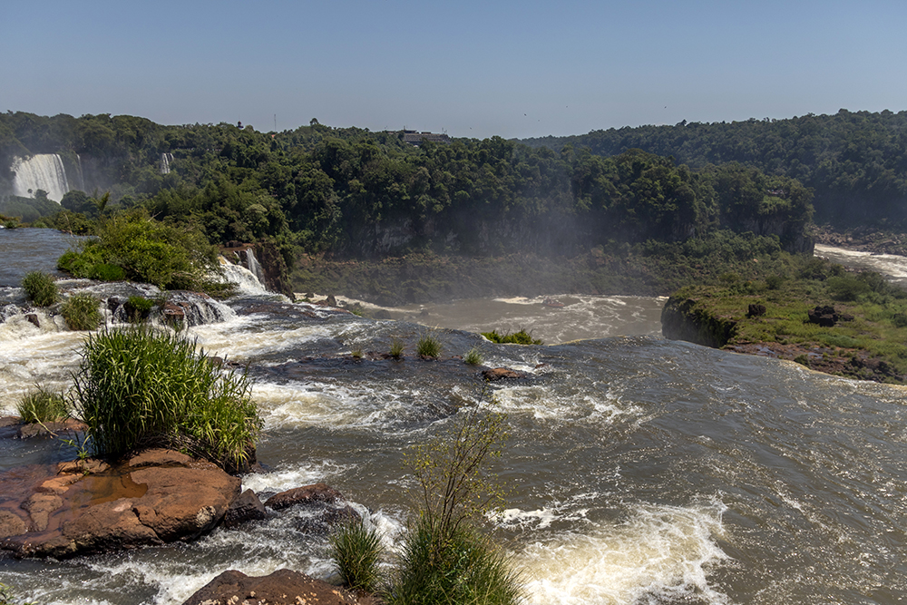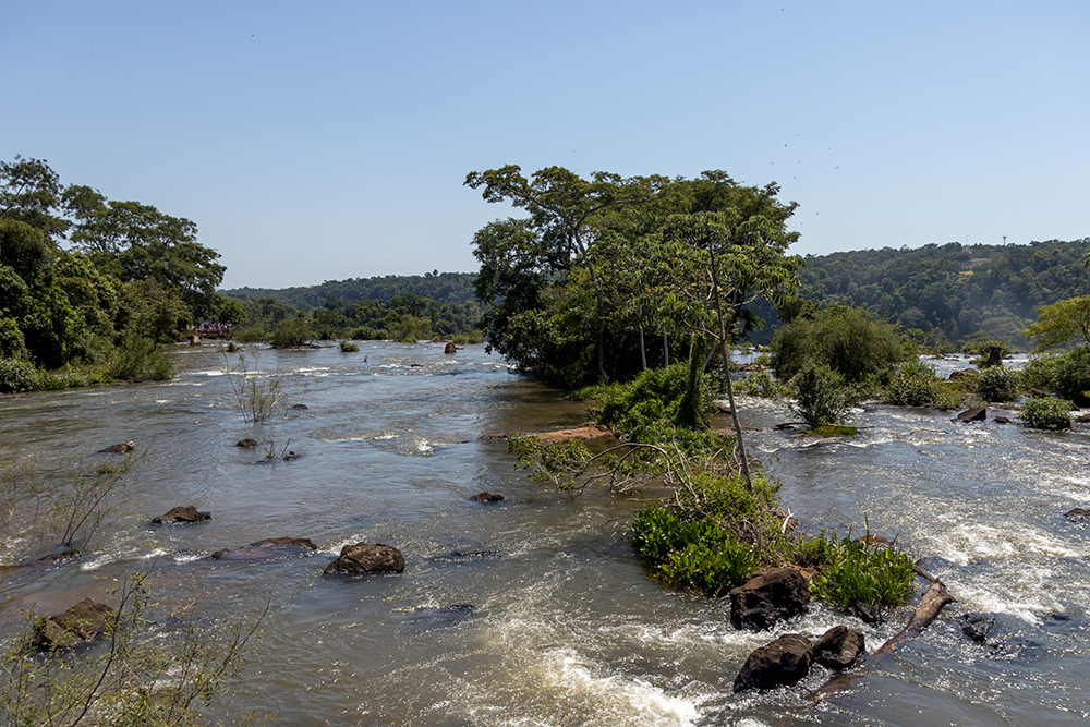 Since we would clearly be spending a lot of time waiting, I decided to use that time to look at my surroundings. As a result, I was able to put my anxiety to the side as I noticed how uniquely beautiful the trail was. The majority of the Upper Circuit was comprised of boardwalks that span across the river. The rainforest still grows wherever there is exposed land, creating little islands of green vegetation surrounded by rushing water. This helped give some perspective about how incredibly wide the river is at the top of the falls, and it offered the opportunity to see large catfish swimming below the boardwalk.