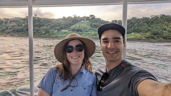 After checking out Las Tres Fronteras, we retraced our path along the river until we arrived at a dock where we lined up to wait for the spontaneous boat tour we’d signed up for. The short tour ended up being quite fun. Our captain drove us to see a small waterfall on the Brazilian side of the Iguazú River, then let us passengers take turns steering our little boat toward Paraguay. Along the way a couple of kids discovered that Vince and I are terrible at speaking Spanish (which isn’t for lack of trying), and reacted with shock and incredulity as their dad explained to them that we were English speakers. Of course, we do have a reasonable amount of Spanish comprehension, so we understood most of the exchange, and found it equal parts amusing and embarrassing. We floated across the Paraguayan border at sunset and had the chance to take a few pictures. Now someday we’ll be able look back on our lives and claim that we’ve “been to Paraguay” on an extreme technicality.